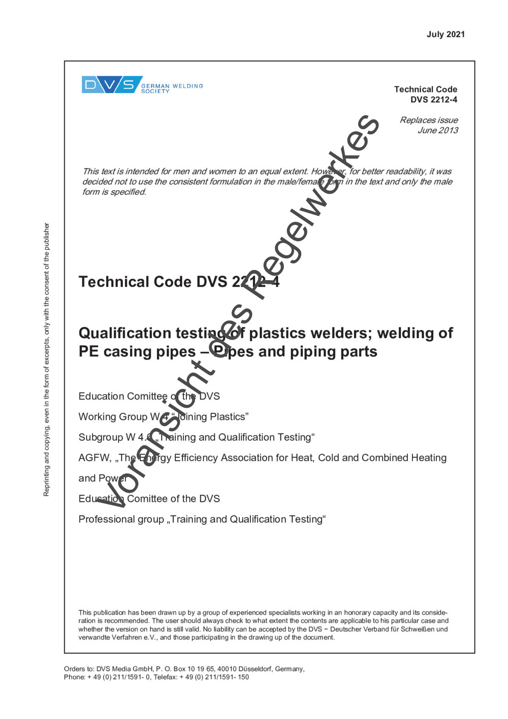 Qualification testing of plastics welders; welding of PE casing pipes – Pipes and piping parts