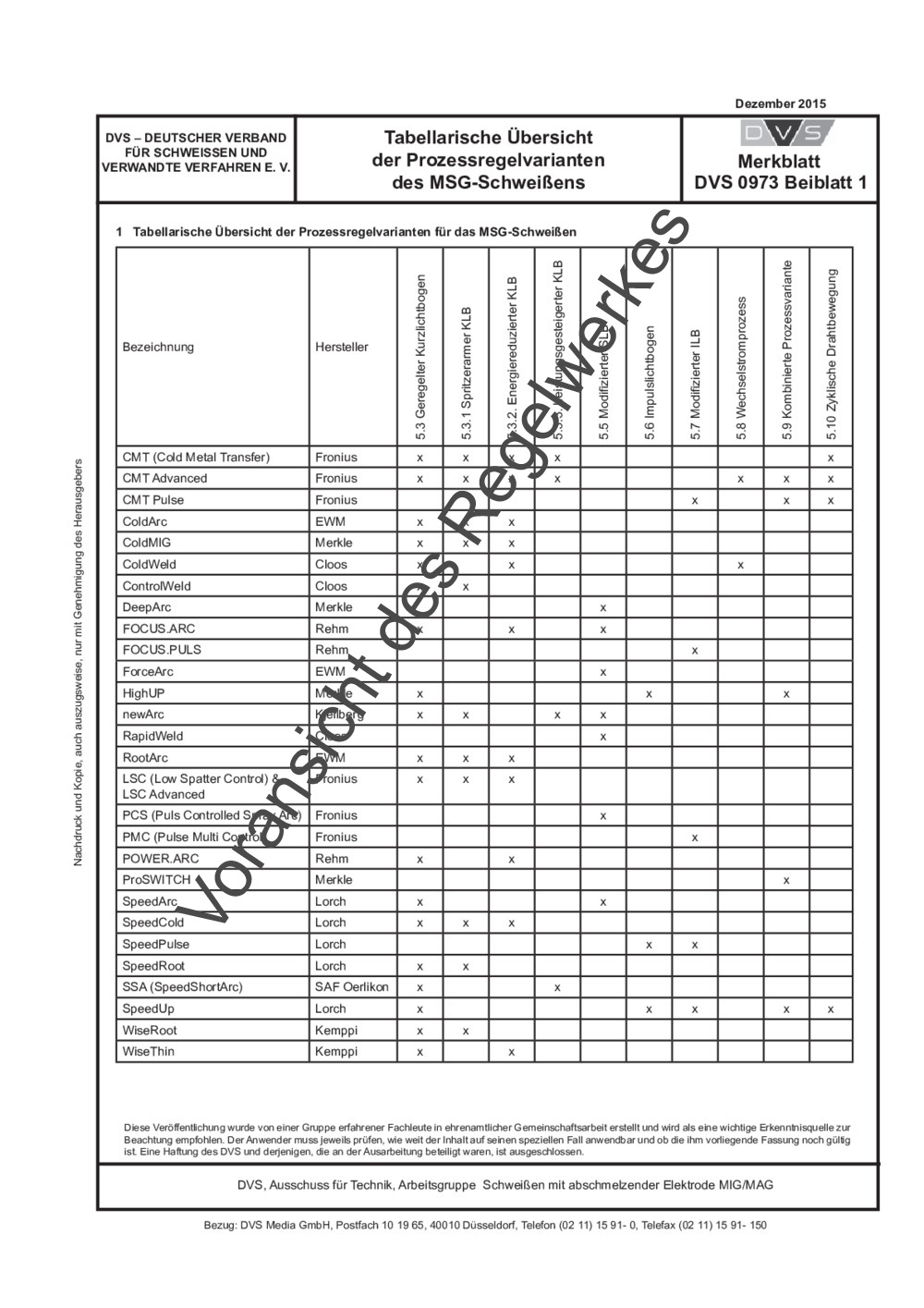Dieses Beiblatt enthält eine tabellarische Übersicht der Prozessregelvarianten für das MSG-Schweißen