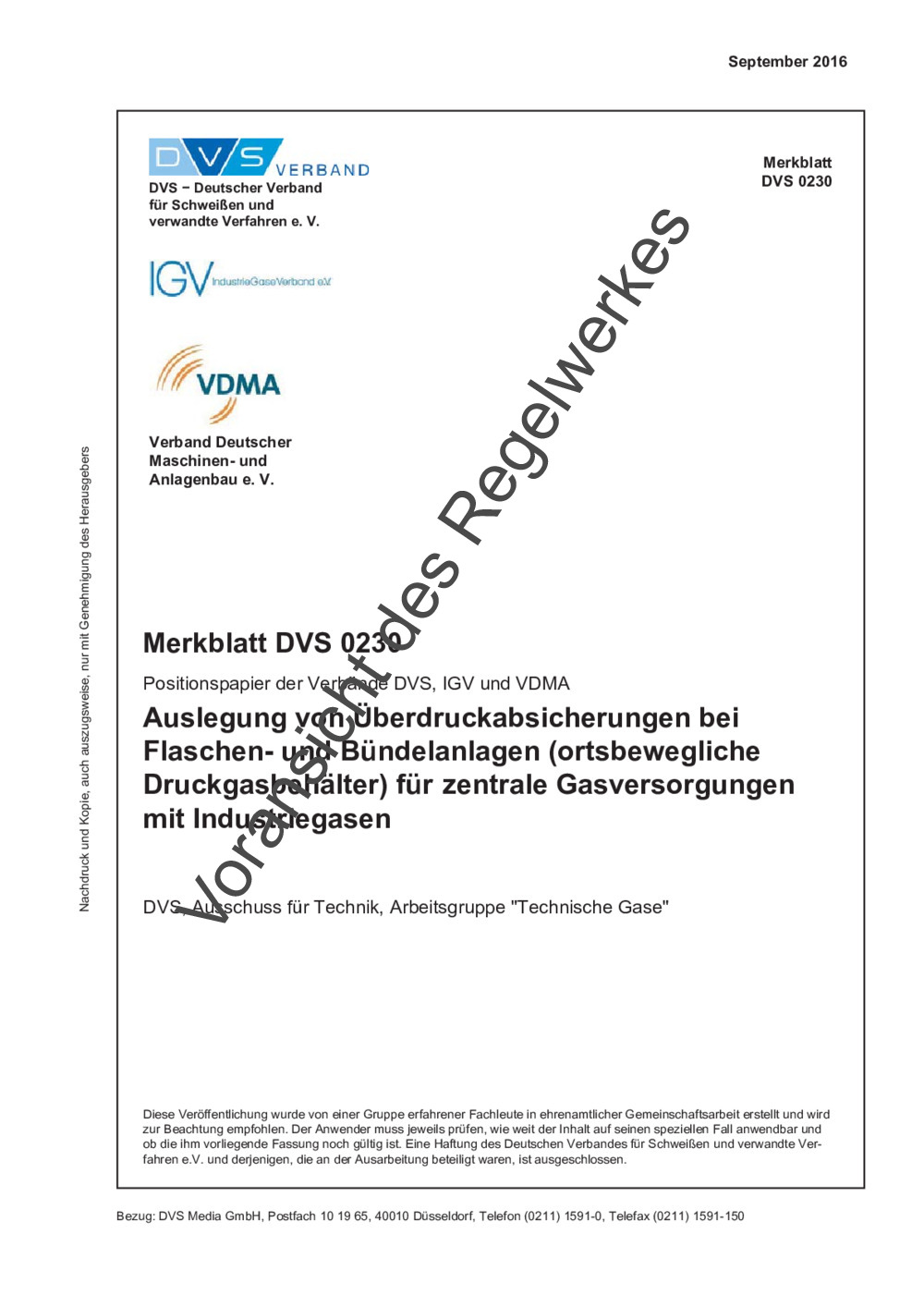 Die Auslegung von Überdruckabsicherungen bei Flaschen- und Bündelbatterieanlagen für zentrale Gasversorgungen führt immer wieder zu Diskussionen unter den Herstellern und Verwendern. Worst-Case Betrachtungen bzw. Berechnungen mit max. Vordruck und freien Bohrungsquerschnitten etc. werden oft realitätsfern interpretiert und geben oftmals unrealistische Gasmengen für die Überdruckabsicherungen vor. Aus diesem Grund haben sich Fachexperten der drei Fachverbände DVS, IGV und VDMA zu diesem Thema intensiv ausgetauscht und die Ergebnisse in dem Positionspapier festgehalten. Das Positionspapier beschreibt die Auslegungsmöglichkeiten von Überdruckabsicherungen für Flaschen- und Bündelbatterieanlagen für zentrale Gasversorgungen von Industriegasen, incl. verflüssigter Gase, z. B. Kohlendioxid, ausgenommen Flüssiggase nach DIN 51622 im Bereich der DVGW und Acetylen.