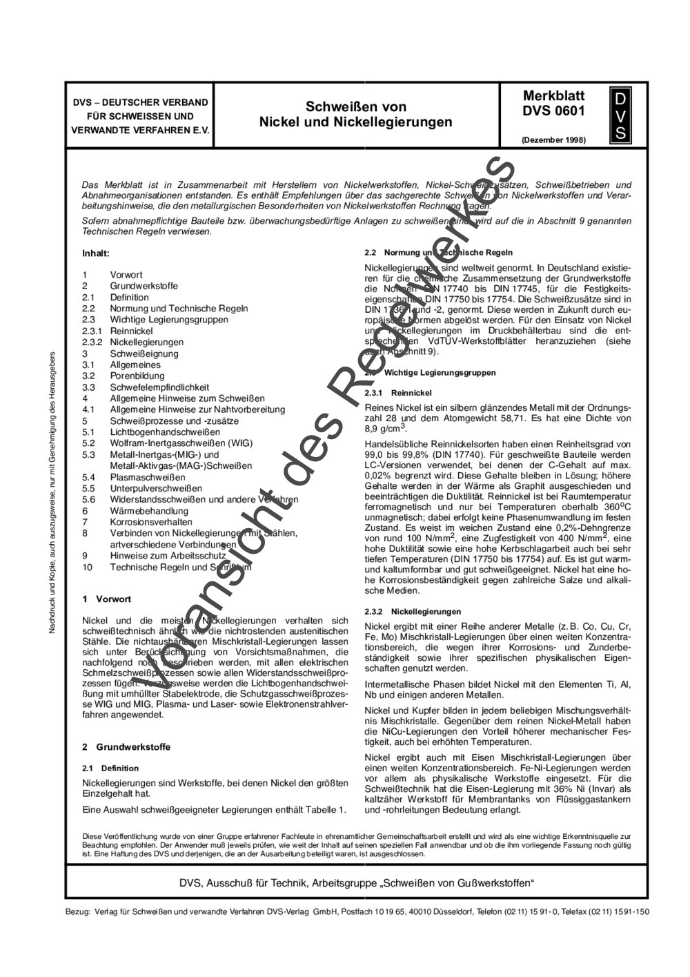 Das Merkblatt ist in Zusammenarbeit mit Herstellern von Nickelwerkstoffen, Nickel-Schweißzusätzen, Schweißbetrieben und Abnahmeorganisationen entstanden. Es enthält Empfehlungen über das sachgerechte Schweißen von Nickelwerkstoffen und Verarbeitungshinweise, die den metallurgischen Besonderheiten von Nickelwerkstoffen Rechnung tragen. Sofern abnahmepflichtige Bauteile bzw. überwachungsbedürftige Anlagen zu schweißen sind, wird auf die in Abschnitt 9 genannten Technischen Regeln verwiesen.
