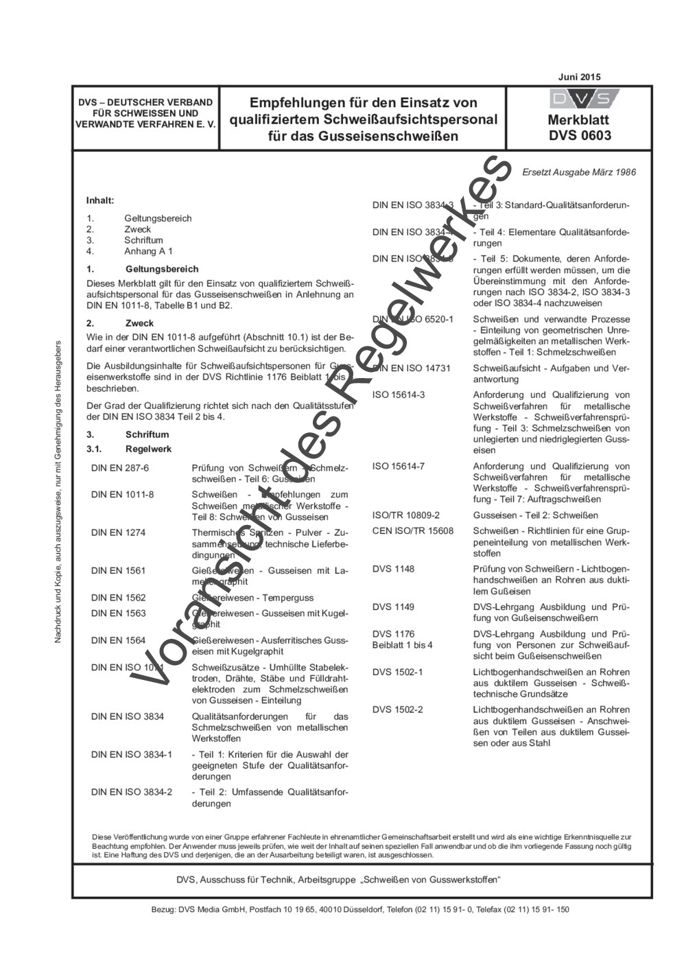 Dieses Merkblatt gilt für den Einsatz von qualifiziertem Schweißaufsichtspersonal für das Gusseisenschweißen in Anlehnung an DIN EN 1011-8, Tabelle B1 und B2.