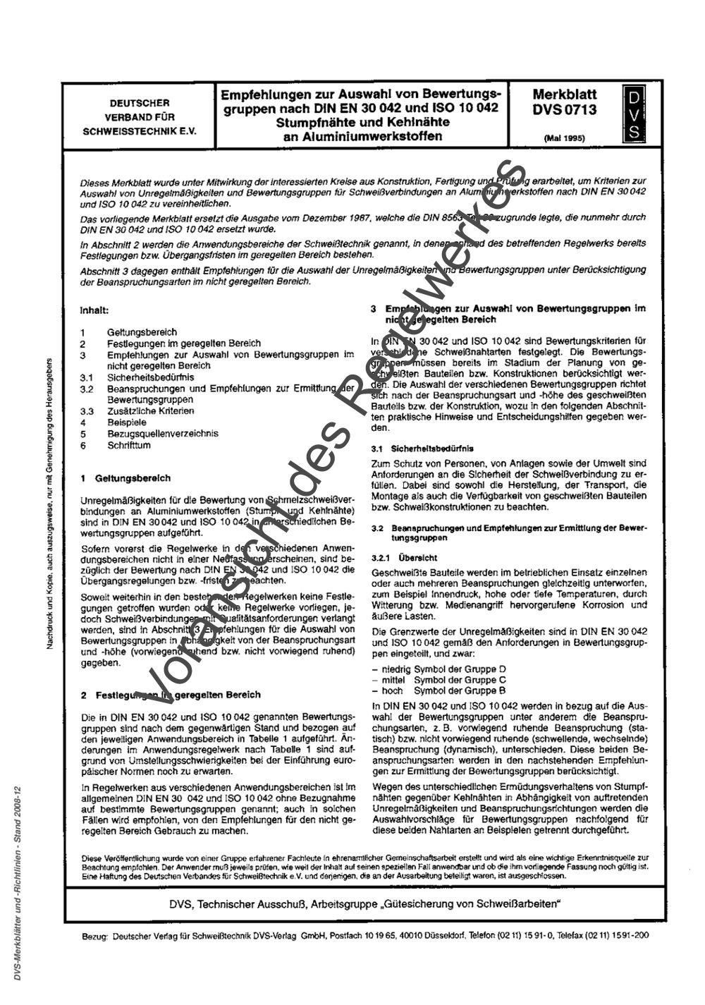 Unregelmäßigkeiten für die Bewertung von Schmelzschweißverbindungen an Aluminiumwerkstoffen (Stumpf- und Kehlnähte) sind in DIN EN 30 042 und ISO 10042 in unterschiedlichen Bewertungsgruppen aufgeführt. Sofern vorerst die Regelwerke in den verschiedenen Anwendungsbereichen nicht in einer Neufassung erscheinen, sind bezüglich der Bewertung nach DIN EN 30 042 und ISO 10 042 die Übergangsregelungen bzw. -fristen zu beachten. Soweit weiterhin in den bestehenden Regelwerken keine Festlegungen getroffen wurden oder keine Regelwerke vorliegen, jedoch Schweißverbindungen mit Qualitätsanforderungen verlangt werden, sind in Abschnitt 3 Empfehlungen für die Auswahl von Bewertungsgruppen in Abhängigkeit von der Beanspruchungsart und -höhe (vorwiegend ruhend bzw. nicht vorwiegend ruhend) gegeben.