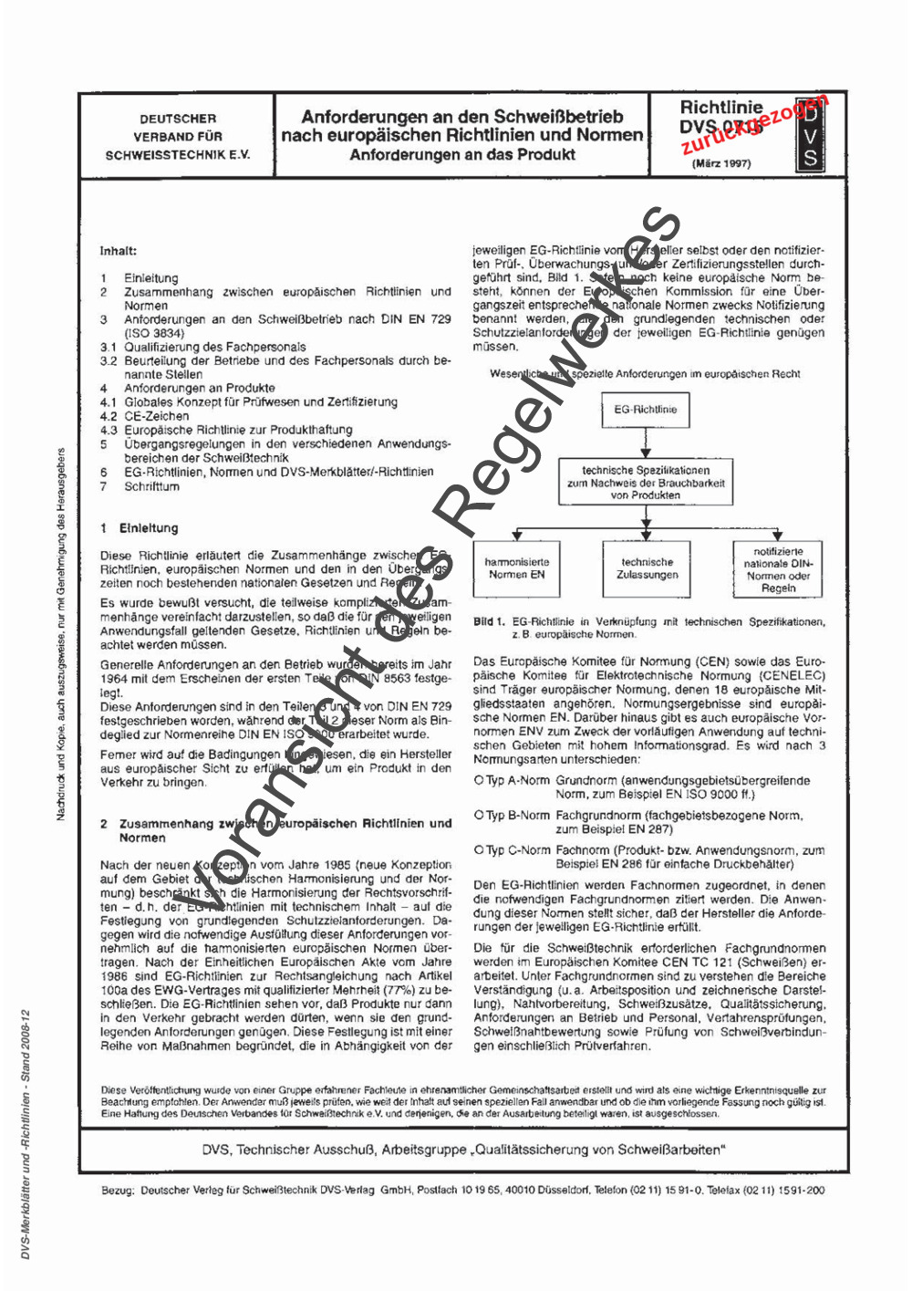 Diese Richtlinie erläutert die Zusammenhänge zwischen EG-Richtlinien, europäischen Normen und den in den Übergangszeiten noch bestehenden nationalen Gesetzen und Regeln. Es wurde bewusst versucht, die teilweise komplizierten Zusammenhänge vereinfacht darzustellen, so dass die für den jeweiligen Anwendungsfall geltenden Gesetze, Richtlinien und Regeln beachtet werden müssen. Generelle Anforderungen an den Betrieb wurden bereits im Jahr 1964 mit dem Erscheinen der ersten Teile von DIN 8563 festgelegt. Diese Anforderungen sind in den Teilen 3 und 4 von DIN EN 729 festgeschrieben worden, während Teil 2 dieser Norm als Bindeglied zur Normenreihe DIN EN ISO 9000 erarbeitet wurde. Ferner wird auf die Bedingungen hingewiesen, die ein Hersteller aus europäischer Sicht zu erfüllen hat, um ein Produkt in den Verkehr zu bringen.