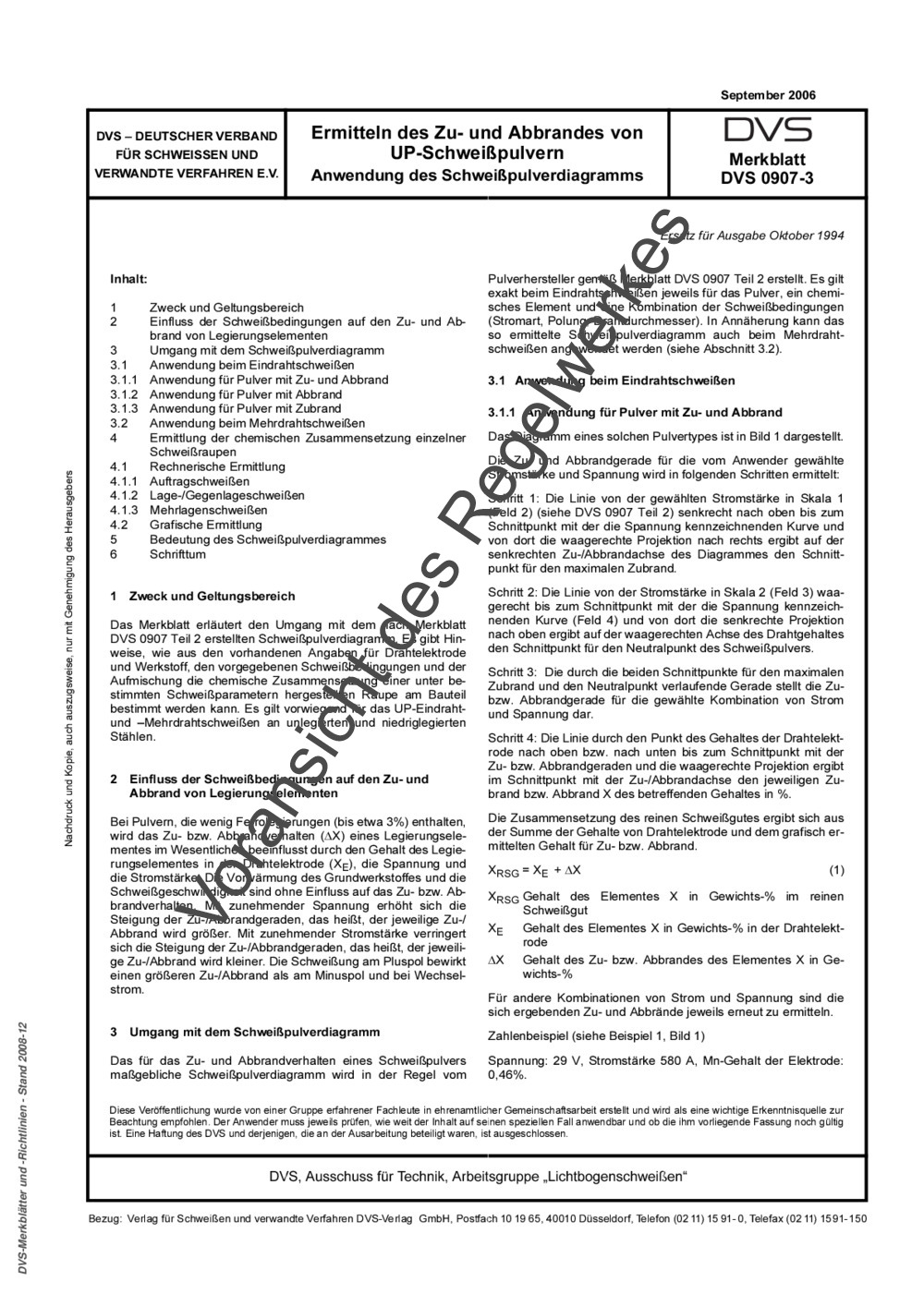 Das Merkblatt erläutert den Umgang mit dem nach Merkblatt DVS 0907 Teil 2 erstellten Schweißpulverdiagramm. Es gibt Hinweise, wie aus den vorhandenen Angaben für Drahtelektrode und Werkstoff, den vorgegebenen Schweißbedingungen und der Aufmischung die chemische Zusammensetzung einer unter bestimmten Schweißparametern hergestellten Raupe am Bauteil bestimmt werden kann. Es gilt vorwiegend für das UP-Eindraht- und -Mehrdrahtschweißen an unlegierten und niedriglegierten Stählen.
