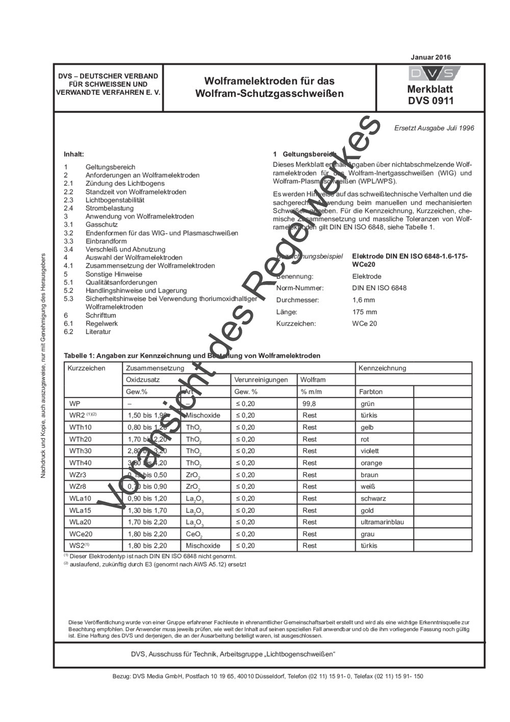 Dieses DVS-Merkblatt enthält Angaben über nichtabschmelzende Wolframelektroden für das Wolfram-Inertgasschweißen (WIG) und Wolfram-Plasmaschweißen (WPL/WPS). Es werden Hinweise auf das schweißtechnische Verhalten und die sachgerechte Anwendung beim manuellen und mechanisierten Schweißen gegeben. Bei den Verfahren mit nicht abschmelzender Elektrode beeinflusst die Wolframelektrode in hohem Maße die Stabilität des Schweißprozesses und die Qualität des Schweißergebnisses. Aufgrund der hohen Temperaturbelastung wird als Elektrodenwerkstoff Wolfram mit einem Schmelzpunkt von etwa 3390 °C (etwa 3660 K) verwendet. Die hohe Temperatur im Bereich des Lichtbogenansatzpunktes muss von der Elektrode ertragen werden, wobei die Wärmebelastung der Elektrode von Minuspolung über wechselnde Polung bis Pluspolung ansteigt. Die Anforderungen an die Wolframelektroden beziehen sich auf das Zünd- bzw. Wiederzündverhalten, die Standzeit, die Gewährleistung eines stabilen Lichtbogens, und die Strombelastbarkeit der Elektrode. Diese Kriterien werden durch die verschiedenen oxydischen Beimengungen maßgeblich beeinflusst.
