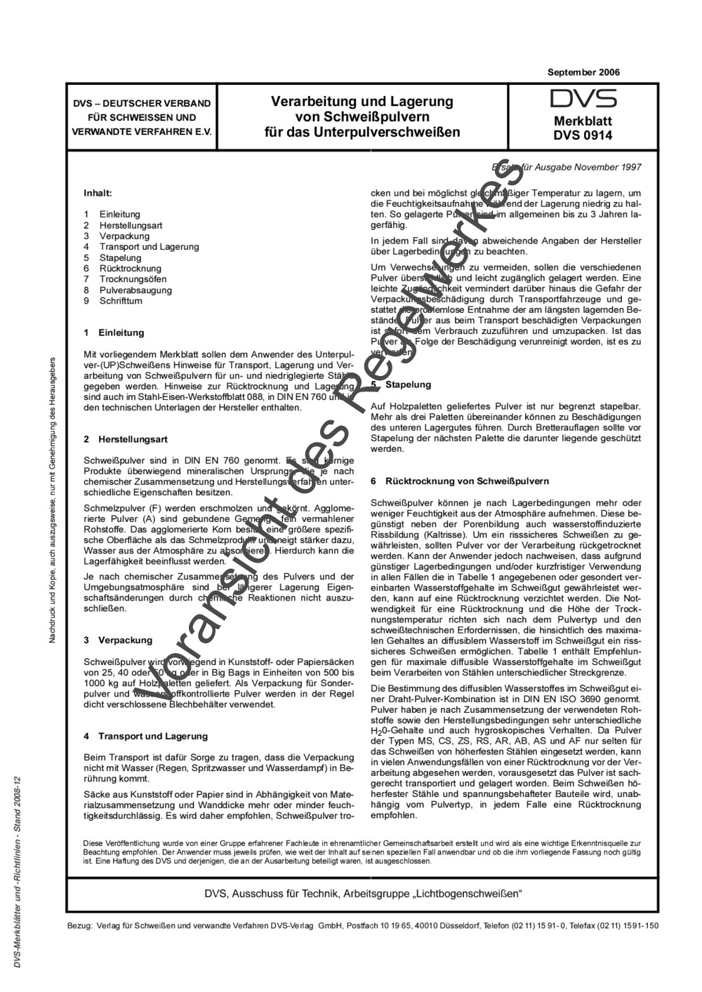 Mit vorliegendem Merkblatt sollen dem Anwender des Unterpulver-(UP)Schweißens Hinweise für Transport, Lagerung und Verarbeitung von Schweißpulvern für un- und niedriglegierte Stähle gegeben werden. Hinweise zur Rücktrocknung und Lagerung sind auch im Stahl-Eisen-Werkstoffblatt 088, in DIN EN 760 und in den technischen Unterlagen der Hersteller enthalten.