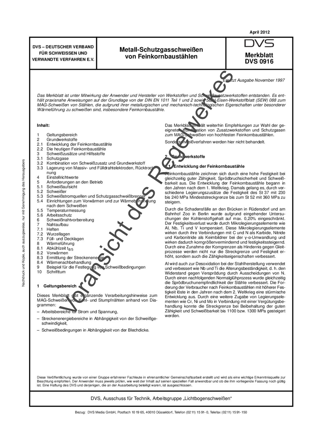 Das Merkblatt ist unter Mitwirkung der Anwender und Hersteller von Werkstoffen und Schweißzusatzwerkstoffen entstanden. Es enthält praxisnahe Anweisungen auf der Grundlage von der DIN EN 1011 Teil 1 und 2 sowie Stahl-Eisen-Werkstoffblatt (SEW) 088 zum MAG-Schweißen von Stählen, die aufgrund ihrer metallurgischen und mechanisch-technologischen Eigenschaften unter besonderer Wärmeführung zu schweißen sind, insbesondere Feinkornbaustähle. Dieses Merkblatt gibt ergänzende Verarbeitungshinweise zum MAG-Schweißen von Kehl- und Stumpfnähten anhand von Diagrammen: –Arbeitsbereiche für Strom und Spannung, –Streckenenergiebereiche in Abhängigkeit von der Schweißgeschwindigkeit, –Schweißbedingungen in Abhängigkeit von der Blechdicke. Das Merkblatt enthält weiterhin Empfehlungen zur Wahl der geeigneten Kombination von Zusatzwerkstoffen und Schutzgasen zum MAG-Schweißen von hochfesten Feinkornbaustählen. Sonderschweißverfahren werden hier nicht behandelt.