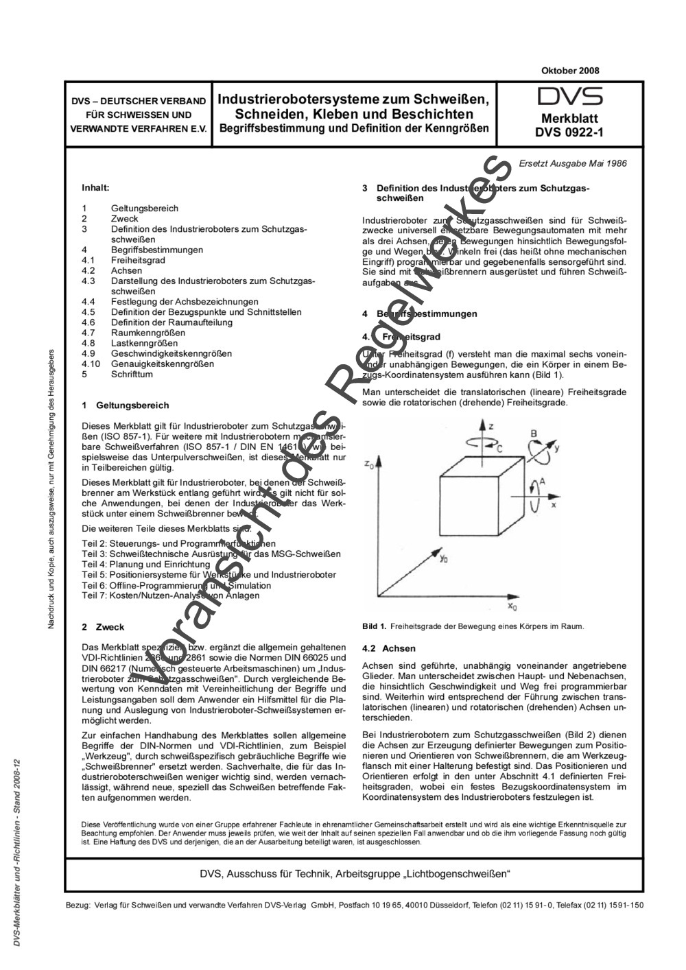 Dieses Merkblatt gilt für Industrieroboter zum Schutzgasschweißen (ISO 857-1). Für weitere mit Industrierobotern mechanisierbare Schweißverfahren (ISO 857-1 / DIN EN 14610), wie beispielsweise das Unterpulverschweißen, ist dieses Merkblatt nur in Teilbereichen gültig. Dieses Merkblatt gilt für Industrieroboter, bei denen der Schweißbrenner am Werkstück entlang geführt wird. Es gilt nicht für solche Anwendungen, bei denen der Industrieroboter das Werkstück unter einem Schweißbrenner bewegt. Die weiteren Teile dieses Merkblatts sind: Teil 2: Steuerungs- und Programmierfunktionen Teil 3: Schweißtechnische Ausrüstung für das MSG-Schweißen Teil 4: Planung und Einrichtung Teil 5: Positioniersysteme für Werkstücke und Industrieroboter Teil 6: Offline-Programmierung und Simulation Teil 7: Kosten/Nutzen-Analyse von Anlagen