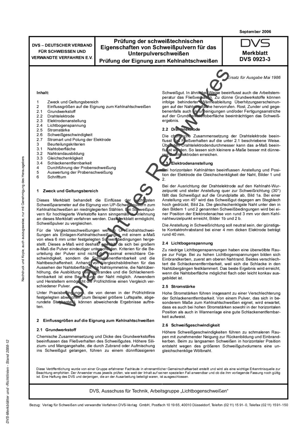 Dieses Merkblatt behandelt die Einflüsse der wichtigsten Schweißparameter auf die Eignung von UP-Schweißpulvern zum Kehlnahtschweißen an niedriglegierten Stählen. Bei Schweißpulvern für hochlegierte Werkstoffe kann sinngemäß in Anlehnung an dieses Merkblatt verfahren werden. Das Merkblatt ermöglicht, Schweißpulver zu vergleichen. Für die Vergleichsschweißungen werden UP-Eindrahtschweißungen als Einlagen-Kehlnahtschweißungen mit einem a-Maß von etwa 6 mm unter festgelegten Schweißbedingungen hergestellt. Dieses a-Maß wird deshalb gewählt, da sich bei großem a-Maß die Pulver eindeutiger unterscheiden. Kriterien für die Beurteilung der Pulver sind nicht die maximal erreichbare Geschwindigkeit, sondern die Schlackenentfernbarkeit und die Nahtbeschaffenheit. Anhand von Vergleichsbildreihen für das Aussehen der Nahtoberfläche, die Nahtsymmetrie, die Nahtüberhöhung, die Ausbildung des Nahtrandes und die Schlackenentfernbarkeit ist eine Beurteilung der Naht möglich. Anwendern und Herstellern ermöglicht die Prüfrichtlinie einen Vergleich verschiedener Pulver. Unter Praxisbedingungen, die von denen in der Prüfrichtlinie festgelegten abweichen (zum Beispiel größere Luftspalte, abgerundete Stegkanten), können abweichende Ergebnisse auftreten.