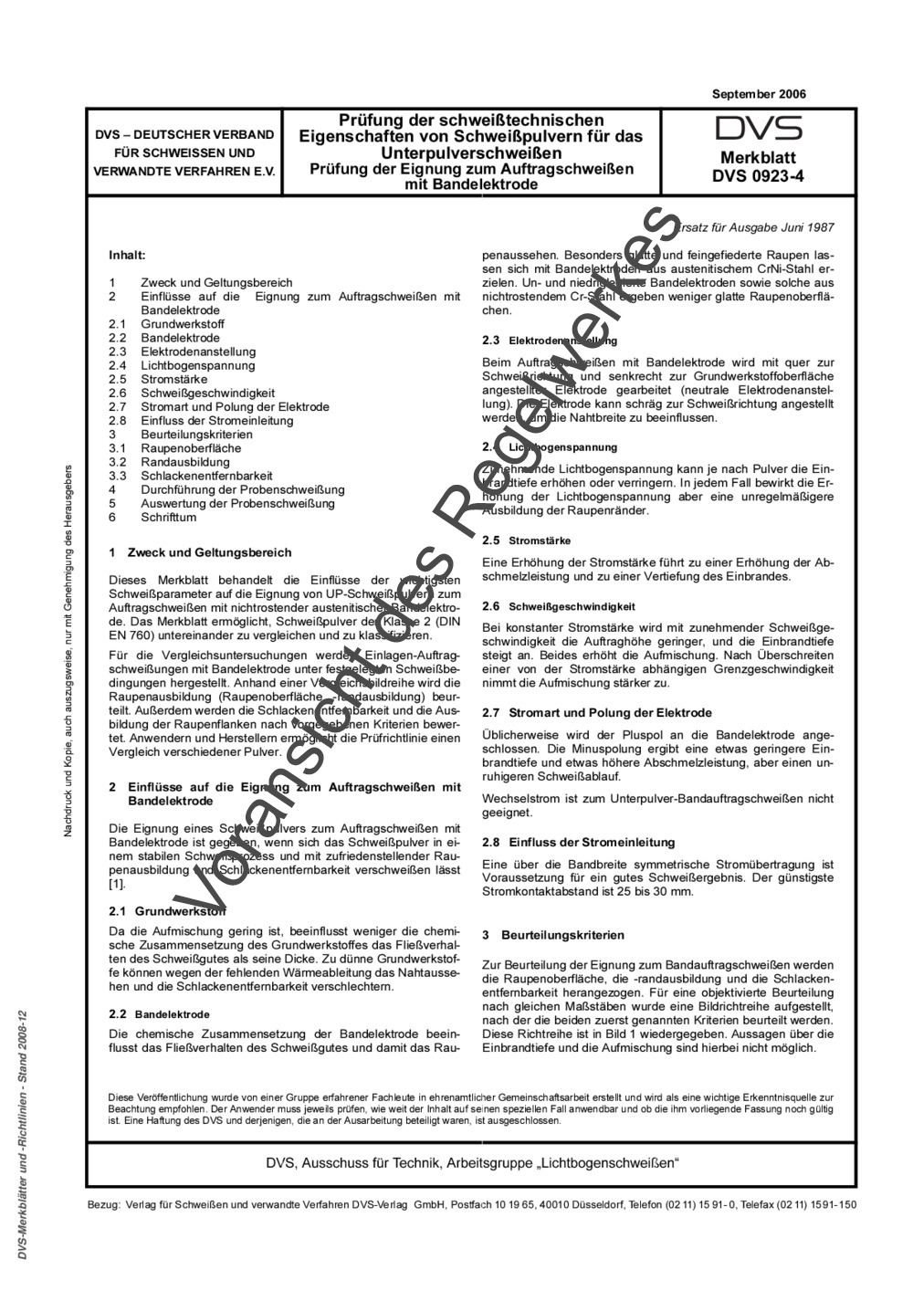 Dieses Merkblatt behandelt die Einflüsse der wichtigsten Schweißparameter auf die Eignung von UP-Schweißpulvern zum Auftragschweißen mit nichtrostender austenitischer Bandelektrode. Das Merkblatt ermöglicht, Schweißpulver der Klasse 2 (DIN EN 760) untereinander zu vergleichen und zu klassifizieren. Für die Vergleichsuntersuchungen werden Einlagen-Auftragschweißungen mit Bandelektrode unter festgelegten Schweißbedingungen hergestellt. Anhand einer Vergleichsbildreihe wird die Raupenausbildung (Raupenoberfläche, -randausbildung) beurteilt. Außerdem werden die Schlackenentfernbarkeit und die Ausbildung der Raupenflanken nach vorgegebenen Kriterien bewertet. Anwendern und Herstellern ermöglicht die Prüfrichtlinie einen Vergleich verschiedener Pulver.