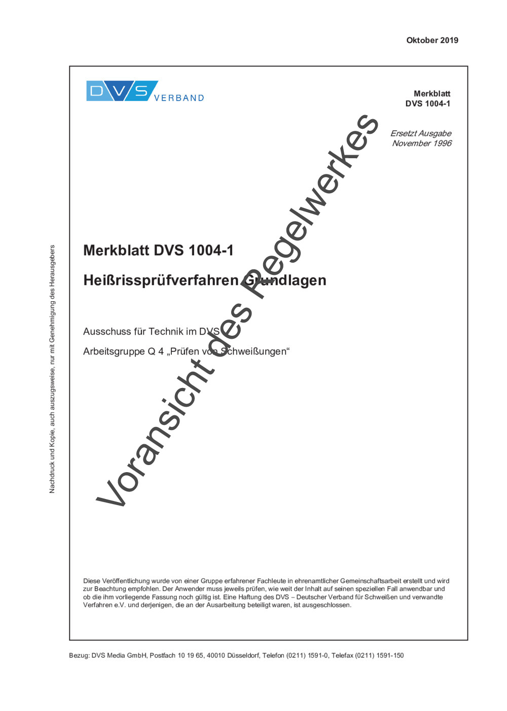 Das Merkblatt ist als Hilfe für den Erzeuger und Verarbeiter heißrissanfälliger Werkstoffe gedacht. Es soll die im Hinblick auf die Heißrissprüfung wesentlichen theoretischen Erkenntnisse in kurzgefasster Form vermitteln. Mitgeltendes DVS-Merkblatt zum Bereich „Heißrissprüfung“ ist: 1004-2 Heißrissprüfverfahren mit fremdbeanspruchten Proben“.