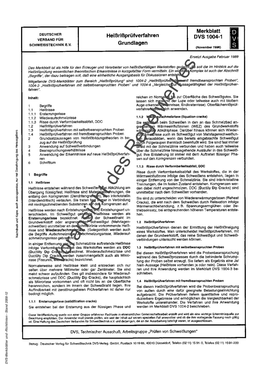 Das Merkblatt ist als Hilfe für den Erzeuger und Verarbeitet von heißrissanfälligen Werkstoffen gedacht. Es soll die im Hinblick auf die Heißrissprüfung wesentlichen theoretischen Erkenntnisse in kurzgefasster Form vermitteln. Ein wichtiger Komplex ist auch der Abschnitt "Begriffe", der dazu beitragen soll, dass eine einheitliche Ausgangsbasis für Diskussionen entsteht. Mitgeltende DVS-Merkblätter zum Bereich "Heißrissprüfung" sind: 1004-2 "Heißrissprüfverfahren mit fremdbeanspruchten Proben", 1004-3 "Heißrissprüfverfahren mit selbstbeanspruchten Proben" und 1004-4 "Vergleiche zur Aussagefähigkeit der Heißrissprüfverfahren.