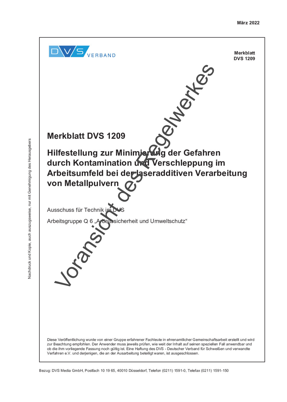 Die LPBF-Fertigungsanlagen (LPBF: Laser Powder Bed Fusion) arbeiten nach dem Laser-Scanner-Prinzip. Ein Laserstrahl scannt die Oberfläche des Pulverbetts mit hoher Geschwindigkeit ab und schmilzt dabei die Partikel auf, so dass nach der Erstarrung eine zusammenhängende Struktur gebildet wird. Nach Absenkung der Bauplattform und definierter Neubeschichtung des Pulverbetts mit unverbrauchtem Pulver wird der Prozess wiederholt durchlaufen, bis das Bauteil fertiggestellt ist. Abgesehen von den Primärpartikeln des Ausgangswerkstoffes entstehen dabei durch die Wechselwirkung mit der Laserstrahlung Stäube und Rauche. Da vielfach recycelte Metallpulver eingesetzt werden, führt diese Vorgehensweise zu einer Zunahme des Feinstaubanteils in den eingesetzten Werkstoffen. Das vorliegende Merkblatt gibt dem Anwender im Arbeitsumfeld bei der laseradditiven Verarbeitung von Metallpulvern eine Hilfestellung zur Minimierung der Gefahren durch Kontamination und Verschleppung von aus dem Prozess freigesetzten Gefahrstoffen. In diesem Zusammenhang relevante Regeln und Verordnungen werden aufgeführt.