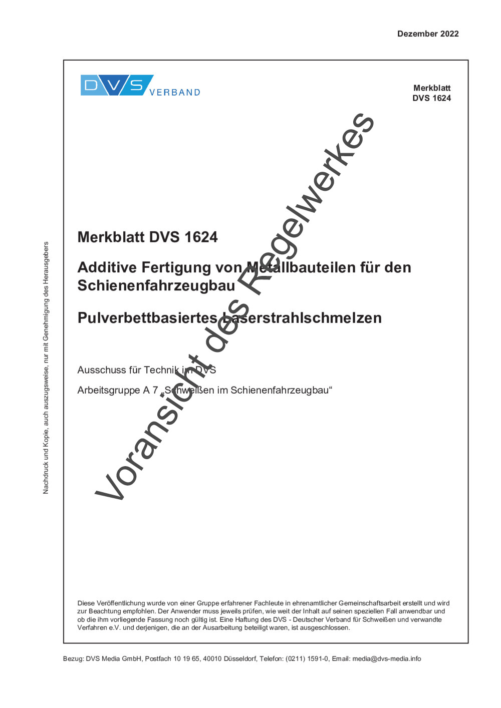An die im Bahnsektor (Schienenfahrzeugbau im öffentlichen Nah-, Regional- und Fernverkehr) sowie im Infrastrukturbereich eingesetzten metallische Bauteile werden hohe Anforderungen in Bezug auf die Qualität und Sicherheit gestellt. Für die bisher dafür verwendeten, konventionell hergestellten metallischen Werkstoffe sind die Schweißeignung und die Materialeigenschaften in den jeweils vorhandenen Werkstoffnormen ausgewiesen. Für Werkstoffe, die aus dem Powder Bed Fusion-Laser Beam Metal Verfahren (im Folgenden mit „PBF-LB/M“ bezeichnet) hervorgehen, liegen solche Normen bisher nicht vor. Die nachfolgend zusammengestellten Spezifikationen und der gewählte methodische Ansatz sollen eine Verfahrensqualifizierung der PBF-LB/M-Fertigung ermöglichen. In diesem Zusammenhang werden die Inhalte der für eine Qualifizierung notwendigen Vorgabe- und Nachweisdokumente benannt. Ziel ist eine mögliche Verfahrensqualifizierung gemäß diesem Merkblatt zur Sicherstellung der erforderlichen Produktqualität.