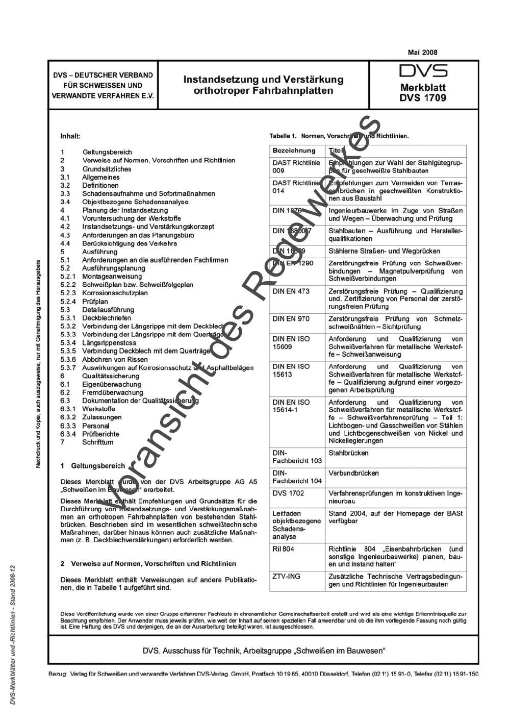 Dieses Merkblatt wurde von der DVS Arbeitsgruppe AG A5 .Schweißen im Bauwesen" erarbeitet. Dieses Merkblatt enthält Empfehlungen und Grundsätze für die Durchführung von Instandsetzungs- und Verstärkungsmaßnahmen an orthotropen Fahrbahnplatten von bestehenden Stahl-brücken. Beschrieben sind im wesentlichen schweißtechnische Maßnahmen, darüber hinaus können auch zusätzliche Maßnahmen (z.B. Deckblechverstärkungen) erforderlich werden.