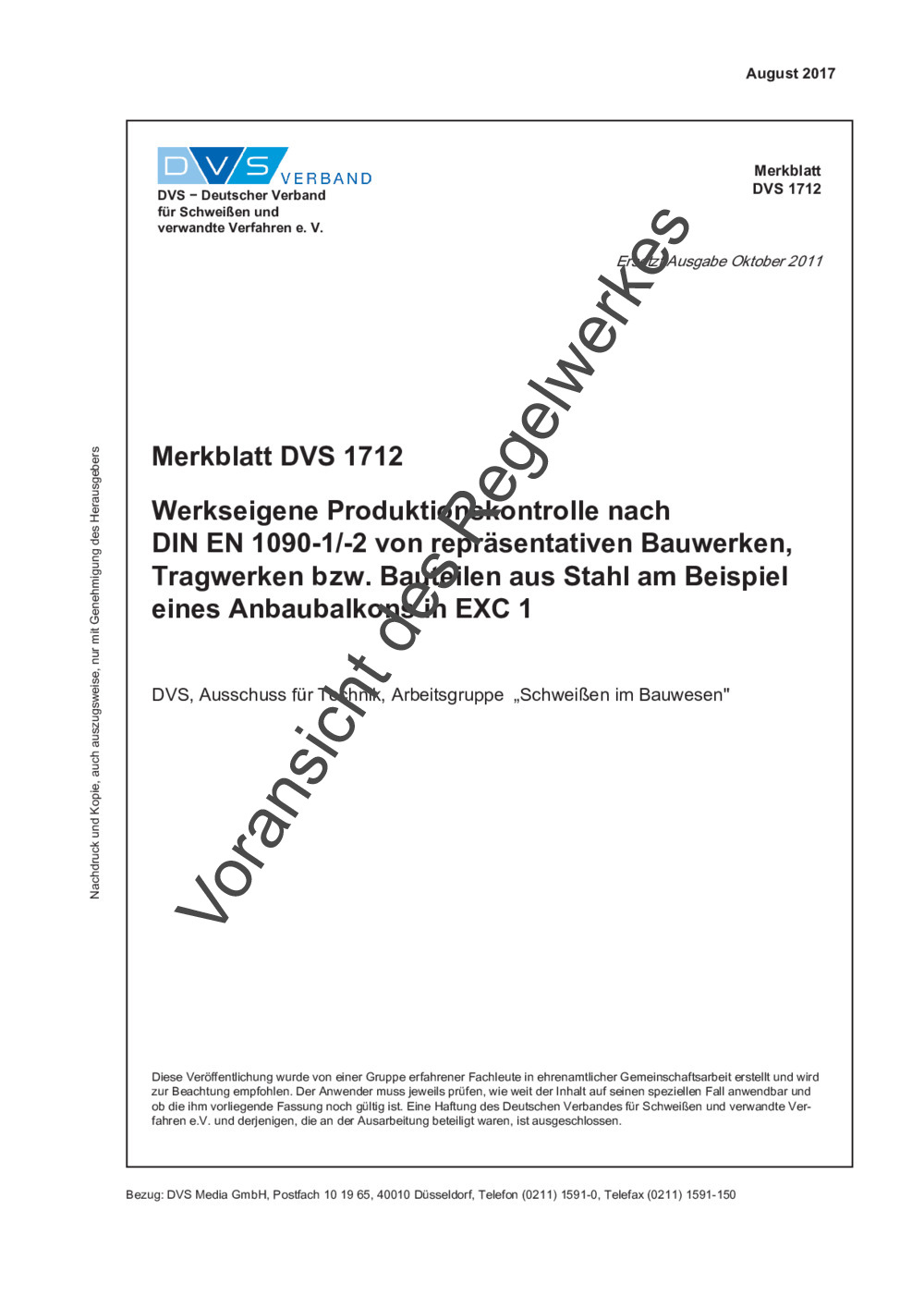 Das Merkblatt DVS 1712 richtet sich an Hersteller, die in der Ausführungsklasse 1 (EXC 1) tätig sind. Es beschreibt an einem konkreten Beispiel, welche Anforderungen zur Ausführung und Dokumentation ein Betrieb nach DIN EN 1090-1 und DIN EN 1090-2 erfüllen muss. Die Vorgaben für die Herstellung sind aus der Darstellung der Auftragszusammenhänge ersichtlich. In diesem Beispiel werden alle Vorgaben wie Bemessung, Werkstoffauswahl, Anforderungen an die Schweißnahtgüte, Anforderungen an den Korrosionsschutz und die Art der Beschichtung vom Tragwerksplaner vorgegeben. Für die CE-Kennzeichnung hat der Hersteller eine Leistungserklärung zu erstellen. Damit vom Hersteller qualitätsgerecht und wirtschaftlich gefertigt werden kann, soll hier gezeigt werden, wie die Anforderungen an die werkseigene Produktionskontrolle erfüllt werden können. Die Ausfüllung der im Anhang des Merkblattes gezeigten Vorschläge für ein Formularwesen erfolgte beispielhaft. Die Anhänge sind unterteilt in „notwendige“ und „empfohlene“ Unterlagen.