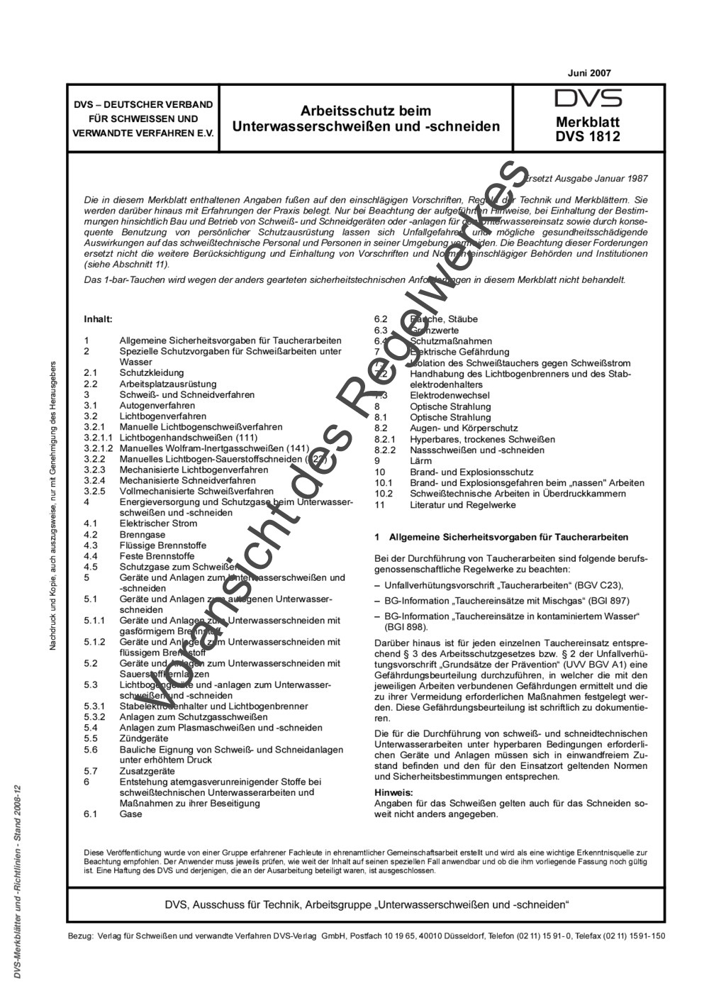 Die in diesem Merkblatt enthaltenen Angaben fußen auf den einschlägigen Vorschriften, Regeln der Technik und Merkblättern. Sie werden darüber hinaus mit Erfahrungen der Praxis belegt. Nur bei Beachtung der aufgeführten Hinweise, bei Einhaltung der Bestimmungen hinsichtlich Bau und Betrieb von Schweiß- und Schneidgeräten oder -anlagen für den Unterwassereinsatz sowie durch konsequente Benutzung von persönlicher Schutzausrüstung lassen sich Unfallgefahren und mögliche gesundheitsschädigende Auswirkungen auf das schweißtechnische Personal und Personen in seiner Umgebung vermeiden. Die Beachtung dieser Forderungen ersetzt nicht die weitere Berücksichtigung und Einhaltung von Vorschriften und Normen einschlägiger Behörden und Institutionen (siehe Abschnitt 11). Das 1-bar-Tauchen wird wegen der anders gearteten sicherheitstechnischen Anforderungen in diesem Merkblatt nicht behandelt.