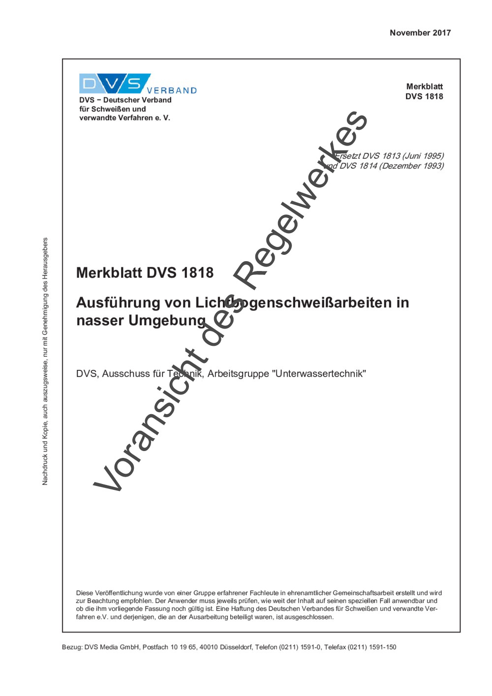 Dieses Merkblatt ergänzt das Merkblatt DVS 1811 „Lichtbogenschweißen unter Wasser" für das Lichtbogenhandschweißen in nasser Umgebung. Es beschreibt Prozesse und Technik, die Durch-führung der Schweißarbeiten und Maßnahmen zur Gütesicherung. Es wendet sich an alle Betriebe und Personen, die Schweißarbeiten unter Wasser planen und ausführen, z. B. Planer, Aufsichtskräfte (Tauchereinsatzleiter, Schweißaufsichtspersonen, etc.) und Unterwasserschweißer. Es geht auch auf die Gefahren durch den elektrischen Strom beim nassen Unterwasserschweißen ein und führt notwendige Schutzmaßnahmen zur Vermeidung von Unfällen auf.