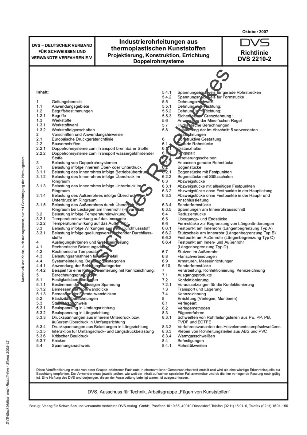 Diese Richtlinie enthält Grundlagen zur Projektierung, Dimensionierung und Errichtung von Doppelrohrsystemen sowie zur Konstruktion und Herstellung von Doppelrohrkomponenten aus thermoplastischen Kunststoffen. Die Anwendung der Richtlinie setzt Erfahrungen in der Kunststoffverarbeitung, im allgemeinen Rohrleitungsbau sowie Kenntnisse zu den Werkstoffen voraus, welche zum Einsatz gelangen. Die in der Richtlinie behandelten Doppelrohrsysteme können dem Transport flüssiger und gasförmiger Stoffe dienen. Ihre Verlegung kann sowohl innerhalb von Gebäuden, Kanälen und Schächten, als auch im Freien erfolgen. Die Dimensionierung erdgedeckter Doppelrohrsysteme wird, was die äußeren Belastungen im Erdreich angeht, in dieser Richtlinie nicht behandelt. Die Richtlinie soll bei der Errichtung von oberirdisch und unterirdisch verlegten Doppelrohrsystemen generelle Berücksichtigung finden. Dies gilt insbesondere dann, wenn der Einsatz eines Doppelrohrsystems aufgrund besonderer Gefährdung von Personen und Umwelt vorgeschrieben ist. Bei Rohrleitungen zum Transport umweltgefährdender oder toxischer Durchflussstoffe bedarf es daher keiner ausdrücklichen Vereinbarung zwischen Auftraggeber und ausführendem Unternehmen hinsichtlich Anwendung dieser Richtlinie. Doppelrohrsysteme, welche verfahrenstechnischen Zwecken dienen (z. B. mit Kühlmittel im Ringraum) werden mit dieser Richtlinie nicht erfasst. Diese Anwendung erfordert im Hinblick auf die Belastungen des Innen- und Außenrohres eine andere Betrachtungsweise. Vorschriften, Bau-, Prüf- und Zulassungsgrundsätze oder behördliche Auflagen, welche die Anwendung dieser Richtlinie fordern, erweitern oder einschränken, müssen gesondert beachtet werden. Hinweise dazu sind Abschnitt 2 zu entnehmen.