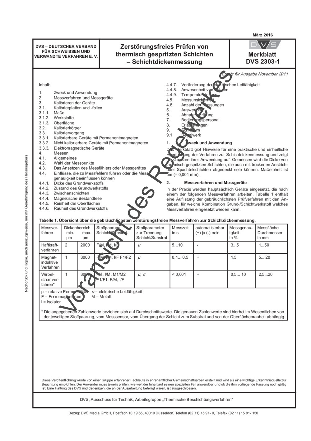 In dem Merkblatt werden die gebräuchlichsten Prüfverfahren zur Sichtdickenmessung mit den Angaben, für welche Kombination Grund-/Schichtwerkstoff welches Messverfahren eingesetzt werden kann, vorgestellt. Das Merkblatt gibt ferner Hinweise für eine praktische und einheitliche Handhabung der Verfahren und zeigt die Grenzen ihrer Anwendung auf. Gemessen wird die Dicke von thermisch gespritzten Schichten, die auch mit trockenen Anstrich oder Spachtelschichten abgedeckt sein können.