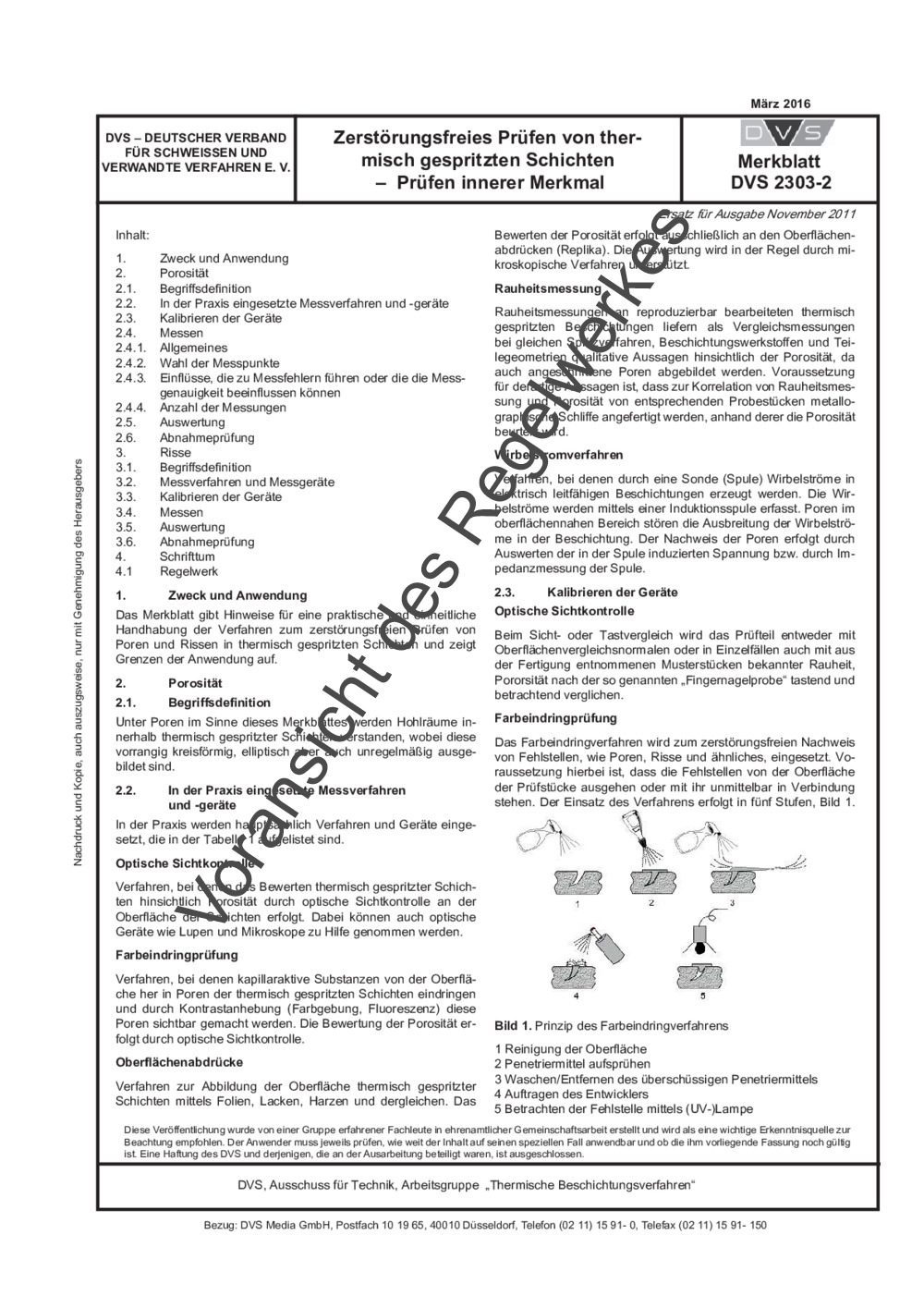 Das Merkblatt gibt Hinweise für eine praktische und einheitliche Handhabung der Verfahren zum zerstörungsfreien Prüfen von Poren und Rissen in thermisch gespritzten Schichten und zeigt Grenzen der Anwendung auf. Unter Poren im Sinne dieses Merkblattes werden Hohlräume innerhalb thermisch gespritzter Schichten verstanden, wobei diese vorrangig kreisförmig, elliptisch aber auch unregelmäßig ausgebildet sind.
