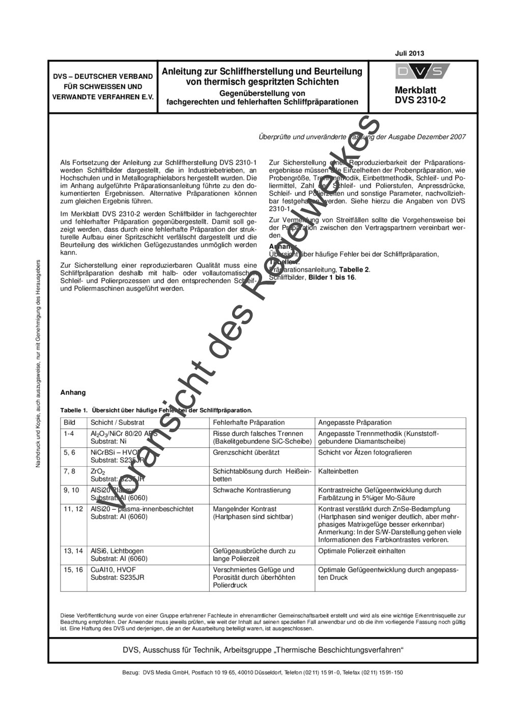Als Fortsetzung der Anleitung zur Schliffherstellung DVS 2310-1 werden Schliffbilder dargestellt, die in Industriebetrieben, an Hochschulen und in Metallographielabors hergestellt wurden. Die im Anhang aufgeführte Präparationsanleitung führte zu den dokumentierten Ergebnissen. Alternative Präparationen können zum gleichen Ergebnis führen. Im Merkblatt DVS 2310-2 werden Schliffbilder in fachgerechter und fehlerhafter Präparation gegenübergestellt. Damit soll gezeigt werden, dass durch eine fehlerhafte Präparation der strukturelle Aufbau einer Spritzschicht verfälscht dargestellt und die Beurteilung des wirklichen Gefügezustandes unmöglich werden kann. Zur Sicherstellung einer reproduzierbaren Qualität muss eine Schliffpräparation deshalb mit halb- oder vollautomatischen Schleif- und Polierprozessen und den entsprechenden Schleifund Poliermaschinen ausgeführt werden. Zur Sicherstellung einer Reproduzierbarkeit der Präparationsergebnisse müssen alle Einzelheiten der Probenpräparation, wie Probengröße, Trennmethodik, Einbettmethodik, Schleif- und Poliermittel, Zahl der Schleif- und Polierstufen, Anpressdrücke, Schleif- und Polierzeiten und sonstige Parameter, nachvollziehbar festgehalten werden. Siehe hierzu die Angaben von DVS 2310-1. Zur Vermeidung von Streitfällen sollte die Vorgehensweise bei der Präparation zwischen den Vertragspartnern vereinbart werden.