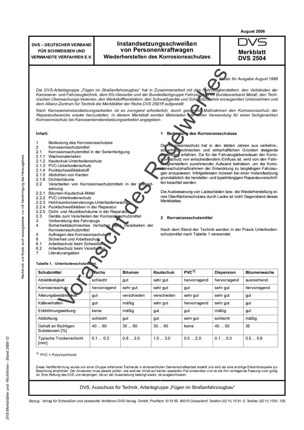 Die DVS-Arbeitsgruppe „Fügen im Straßenfahrzeugbau“ hat in Zusammenarbeit mit den Fahrzeugherstellern, den Verbänden der Karosserie- und Fahrzeugtechnik, dem Kfz-Gewerbe und der Bundesfachgruppe Fahrzeugbau im Bundesverband Metall, den Technischen Überwachungs-Vereinen, den Werkstoffherstellern, den Schweißgeräte und Schweißzubehör erzeugenden Unternehmen und dem Allianz-Zentrum für Technik die Merkblätter der Reihe DVS 2501ff aufgestellt. Nach Karosserieinstandsetzungsarbeiten ist es zwingend erforderlich, durch geeignete Maßnahmen den Korrosionsschutz der Reparaturbereiche wieder herzustellen. In diesem Merkblatt werden Materialien und deren Verwendung für einen fachgerechten Korrosionsschutz bei Karosserieinstandsetzungsarbeiten angegeben.