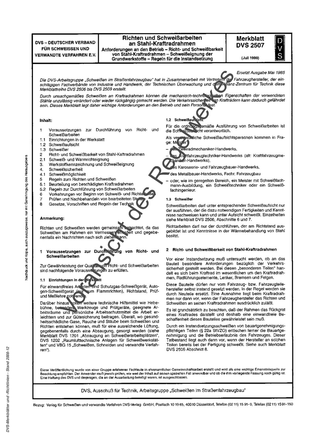 Die DVS-Arbeitsgruppe "Schweißen im Straßenfahrzeugbau" hat in Zusammenarbeit mit Vertretern der Fahrzeughersteller, der einschlägigen Fachverbände von Industrie und Handwerk, der Technischen Überwachung und dem Allianz-Zentrum für Technik diese Merkblattreihe DVS 2506 bis DVS 2509 erstellt. Durch unsachgemäßes Schweißen an Kraftradrahmen können die mechanisch-technologischen Eigenschaften der verwendeten Stähle unzulässig verändert oder wieder rückgängig gemacht werden. Die Verkehrssicherheit von Krafträdern kann dadurch gefährdet sein. Dieses Merkblatt legt daher wichtige Anforderungen an den Betrieb und sein Personal fest.