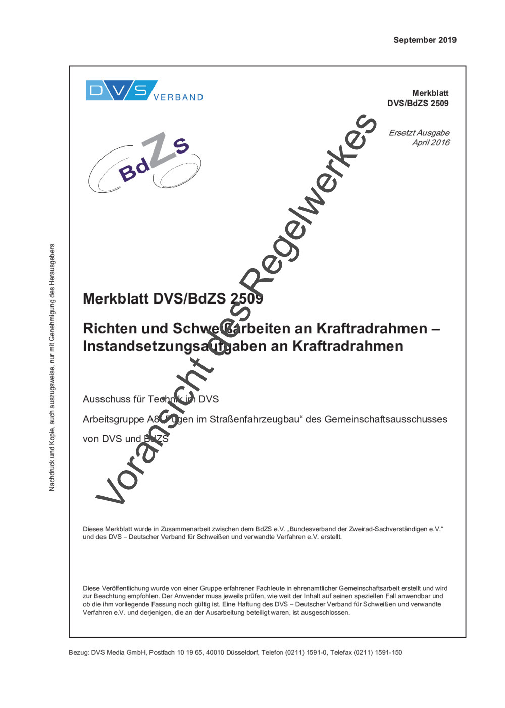 Durch unsachgemäßes Schweißen und Richten an Kraftradbauteilen können die mechanisch-technologischen Eigenschaften der verwendeten Werkstoffe unzulässig verändert oder wieder rückgängig gemacht werden. Die Verkehrssicherheit von Krafträdern kann dadurch gefährdet sein. In diesem Merkblatt werden wesentliche Regeln zum sachgerechten Instandsetzungsschweißen und Richten angegeben. Der Geltungsbereich dieses Merkblattes ist auf Hauptrahmen aus Stahlwerkstoffen begrenzt. Richtarbeiten an Aluminiumrahmen werden ausdrücklich nicht empfohlen.