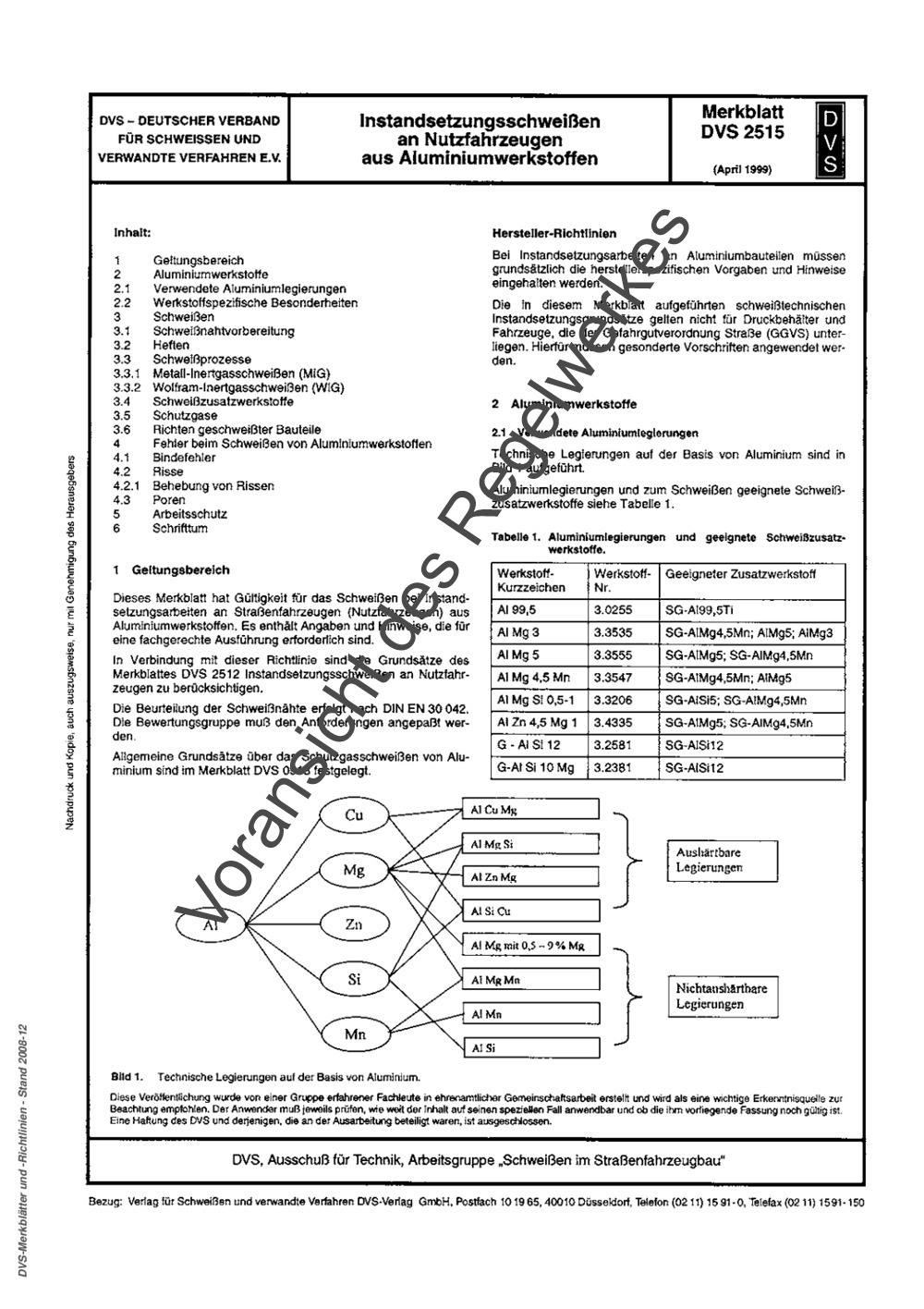 Dieses Merkblatt hat Gültigkeit für das Schweißen bei Instandsetzungsarbeiten an Straßenfahrzeugen (Nutzfahrzeugen) aus Aluminiumwerkstoffen. Es enthält Angaben und Hinweise, die für eine fachgerechte Ausführung erforderlich sind. In Verbindung mit dieser Richtlinie sind die Grundsätze des Merkblattes DVS 2512 Instandsetzungsschweißen an Nutzfahrzeugen zu berücksichtigen. Die Beurteilung der Schweißnähte erfolgt nach DIN EN 30 042. Die Bewertungsgruppe muss den Anforderungen angepasst werden. Allgemeine Grundsätze über das Schutzgasschweißen von Aluminium sind im Merkblatt DVS 0913 festgelegt.
