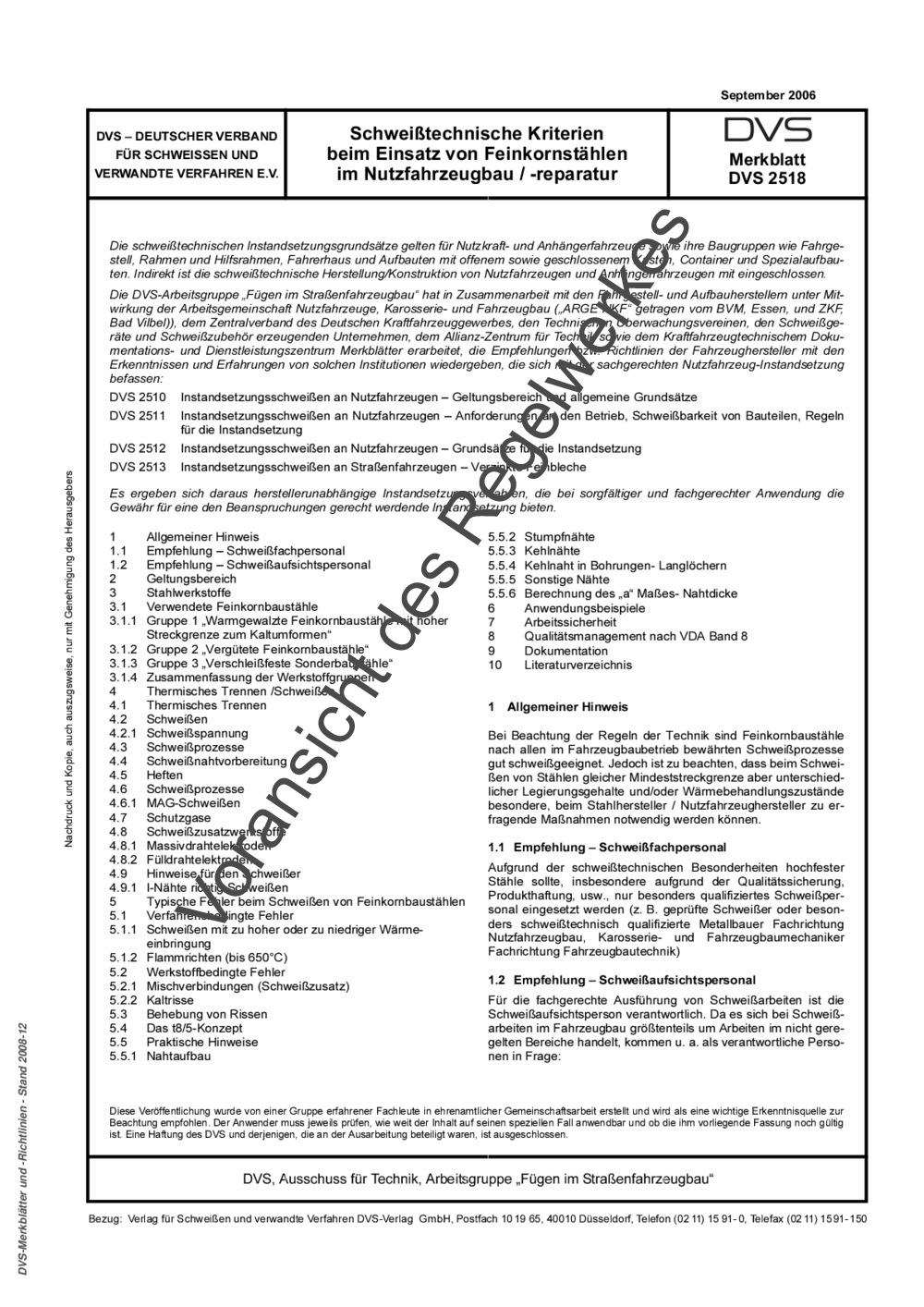 Die schweißtechnischen Instandsetzungsgrundsätze gelten für Nutzkraft- und Anhängerfahrzeuge sowie ihre Baugruppen wie Fahrgestell, Rahmen und Hilfsrahmen, Fahrerhaus und Aufbauten mit offenem sowie geschlossenem Kasten, Container und Spezialaufbauten. Indirekt ist die schweißtechnische Herstellung/Konstruktion von Nutzfahrzeugen und Anhängerfahrzeugen mit eingeschlossen. Die DVS-Arbeitsgruppe „Fügen im Straßenfahrzeugbau“ hat in Zusammenarbeit mit den Fahrgestell- und Aufbauherstellern unter Mitwirkung der Arbeitsgemeinschaft Nutzfahrzeuge, Karosserie- und Fahrzeugbau („ARGE NKF“ getragen vom BVM, Essen, und ZKF, Bad Vilbel)), dem Zentralverband des Deutschen Kraftfahrzeuggewerbes, den Technischen Überwachungsvereinen, den Schweißgeräte und Schweißzubehör erzeugenden Unternehmen, dem Allianz-Zentrum für Technik sowie dem Kraftfahrzeugtechnischem Dokumentations- und Dienstleistungszentrum Merkblätter erarbeitet, die Empfehlungen bzw. Richtlinien der Fahrzeughersteller mit den Erkenntnissen und Erfahrungen von solchen Institutionen wiedergeben, die sich mit der sachgerechten Nutzfahrzeug-Instandsetzung befassen: DVS 2510 Instandsetzungsschweißen an Nutzfahrzeugen – Geltungsbereich und allgemeine Grundsätze DVS 2511 Instandsetzungsschweißen an Nutzfahrzeugen – Anforderungen an den Betrieb, Schweißbarkeit von Bauteilen, Regeln für die Instandsetzung DVS 2512 Instandsetzungsschweißen an Nutzfahrzeugen – Grundsätze für die Instandsetzung DVS 2513 Instandsetzungsschweißen an Straßenfahrzeugen – Verzinkte Feinbleche Es ergeben sich daraus herstellerunabhängige Instandsetzungsverfahren, die bei sorgfältiger und fachgerechter Anwendung die Gewähr für eine den Beanspruchungen gerecht werdende Instandsetzung bieten.