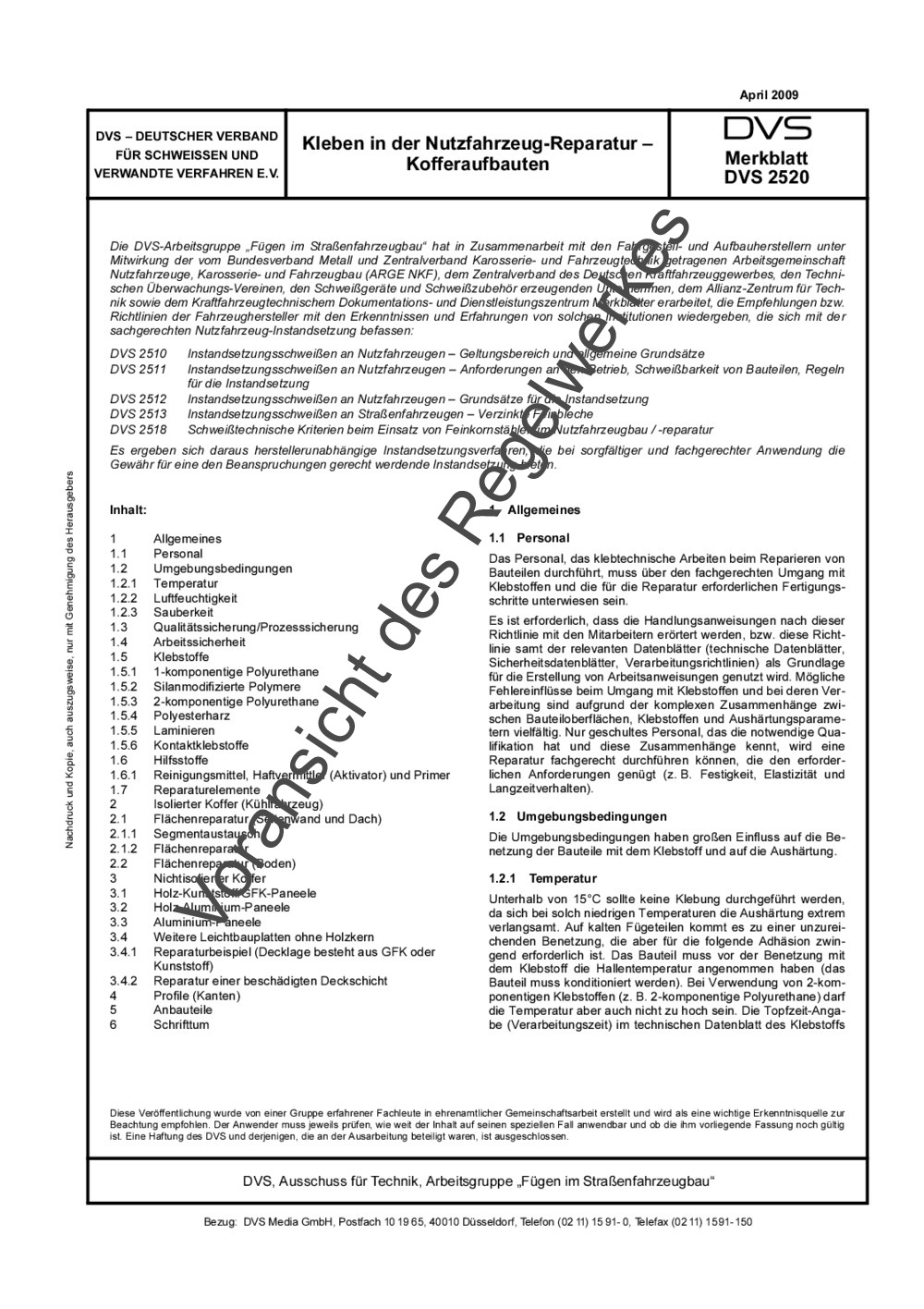 Die DVS-Arbeitsgruppe „Fügen im Straßenfahrzeugbau“ hat in Zusammenarbeit mit den Fahrgestell- und Aufbauherstellern unter Mitwirkung der vom Bundesverband Metall und Zentralverband Karosserie- und Fahrzeugtechnik getragenen Arbeitsgemeinschaft Nutzfahrzeuge, Karosserie- und Fahrzeugbau (ARGE NKF), dem Zentralverband des Deutschen Kraftfahrzeuggewerbes, den Technischen Überwachungs-Vereinen, den Schweißgeräte und Schweißzubehör erzeugenden Unternehmen, dem Allianz-Zentrum für Technik sowie dem Kraftfahrzeugtechnischem Dokumentations- und Dienstleistungszentrum Merkblätter erarbeitet, die Empfehlungen bzw. Richtlinien der Fahrzeughersteller mit den Erkenntnissen und Erfahrungen von solchen Institutionen wiedergeben, die sich mit der sachgerechten Nutzfahrzeug-Instandsetzung befassen: DVS 2510 Instandsetzungsschweißen an Nutzfahrzeugen – Geltungsbereich und allgemeine Grundsätze DVS 2511 Instandsetzungsschweißen an Nutzfahrzeugen – Anforderungen an den Betrieb, Schweißbarkeit von Bauteilen, Regeln für die Instandsetzung DVS 2512 Instandsetzungsschweißen an Nutzfahrzeugen – Grundsätze für die Instandsetzung DVS 2513 Instandsetzungsschweißen an Straßenfahrzeugen – Verzinkte Feinbleche DVS 2518 Schweißtechnische Kriterien beim Einsatz von Feinkornstählen im Nutzfahrzeugbau/-reparatur Es ergeben sich daraus herstellerunabhängige Instandsetzungsverfahren, die bei sorgfältiger und fachgerechter Anwendung die Gewähr für eine den Beanspruchungen gerecht werdende Instandsetzung bieten.