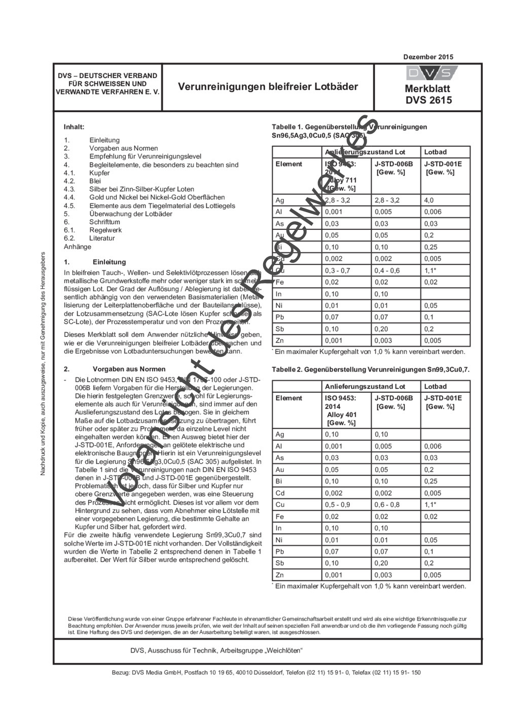 In bleifreien Tauch-, Wellen- und Selektivlötprozessen lösen sich metallische Grundwerkstoffe mehr oder weniger stark im schmelzflüssigen Lot. Der Grad der Auflösung / Ablegierung ist dabei wesentlich abhängig von den verwendeten Basismaterialien (Metallisierung der Leiterplattenoberfläche und der Bauteilanschlüsse), der Lotzusammensetzung (SAC-Lote lösen Kupfer schneller als SC-Lote), der Prozesstemperatur und den Prozesszeiten. Dieses Merkblatt soll dem Anwender nützliche Hinweise geben, wie er die Verunreinigungen bleifreier Lotbäder überwachen und die Ergebnisse von Lotbaduntersuchungen bewerten kann.