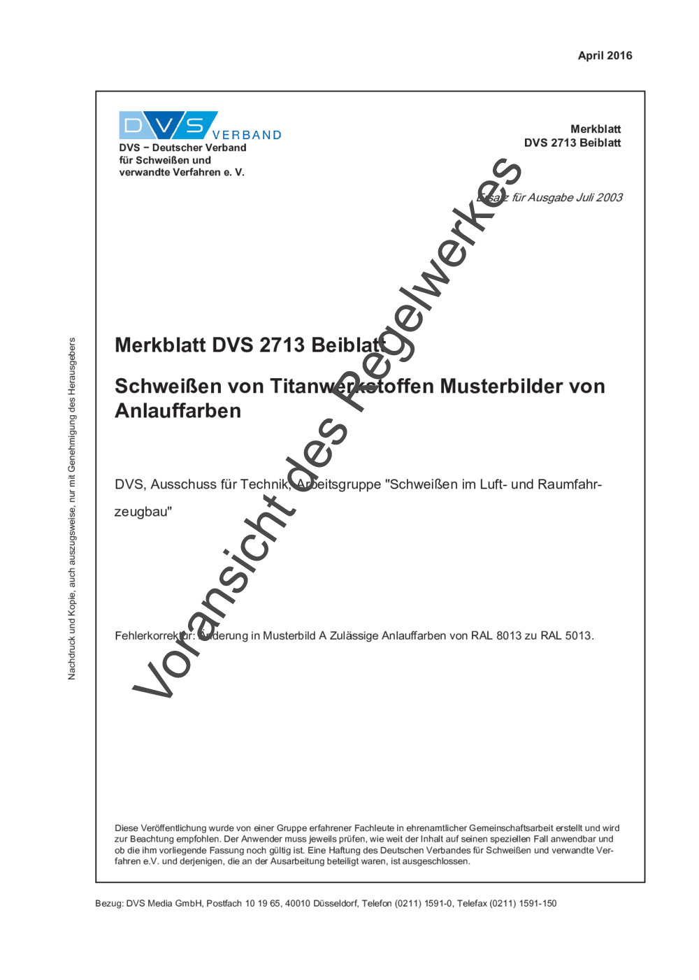 Das Beiblatt zum Merkblatt DVS 2713 dient der Beurteilung von Anlauffarben beim Schweißen von Titanwerkstoffen. Es enthält Musterbilder, welche den Vergleich von zulässigen und unzulässigen Anlauffarben in Abhängigkeit von der Bildungstemperatur und ihrer Lage in der Schweißverbindung bieten.