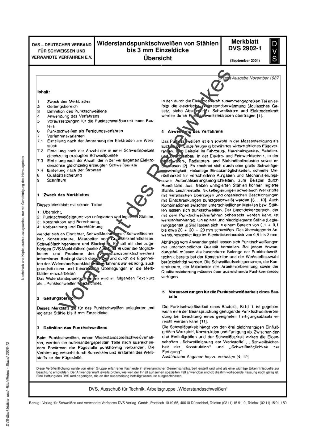 Diese Merkblatt mit seinen Teilen 1: Übersicht, 2: Punktschweißeignung von unlegierten und legierten Stählen, 3: Konstruktion und Berechnung, 4. Vorbereitung und Durchführung wendet sich an Einrichter, Schweißfachmänner, Schweißtechniker, Konstrukteure, Mitarbeiter von Qualitätskontrollstellen, Schweißfachingenieure und Studenten. Es soll mit den zugehörigen DVS-Merkblättern (siehe Abschnitt 9) über die Möglichkeiten und Probleme des Widerstandspunktschweißens informieren. Bedingt durch dieses Ziel und durch die Eigenheiten des Widerstandspunktschweißverfahrens war es nötig, auch grundsätzliche und theoretische Überlegungen in die Merkblätter einzuarbeiten. Da Widerstandspunktschweißen wird im folgenden Text kurz als "Punktschweißen" bezeichnet.