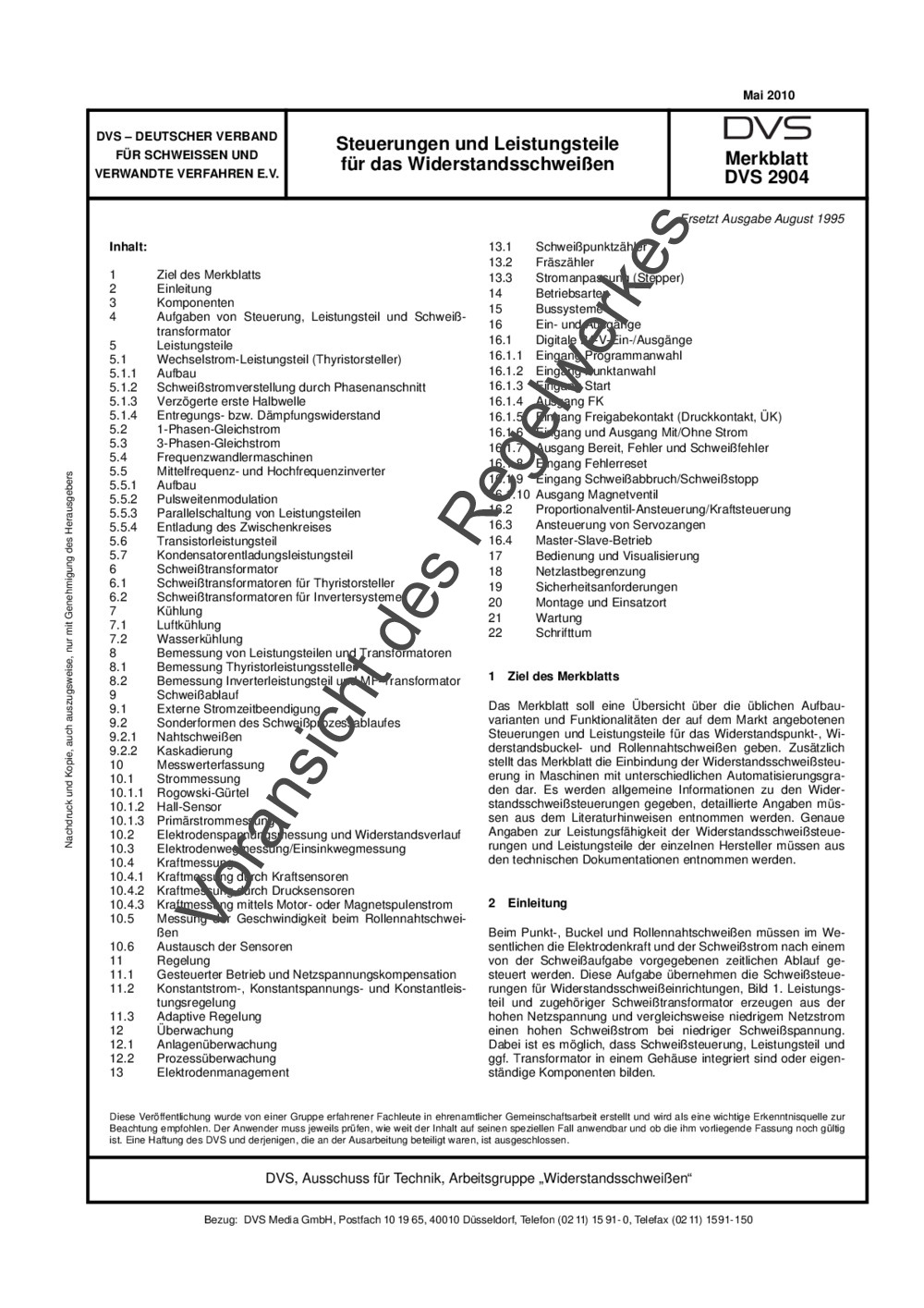 Das Merkblatt soll eine Übersicht über die üblichen Aufbauvarianten und Funktionalitäten der auf dem Markt angebotenen Steuerungen und Leistungsteile für das Widerstandspunkt-, Widerstandsbuckel- und Rollennahtschweißen geben. Zusätzlich stellt das Merkblatt die Einbindung der Widerstandsschweißsteuerung in Maschinen mit unterschiedlichen Automatisierungsgraden dar. Es werden allgemeine Informationen zu den Widerstandsschweißsteuerungen gegeben, detaillierte Angaben müssen aus dem Literaturhinweisen entnommen werden. Genaue Angaben zur Leistungsfähigkeit der Widerstandsschweißsteuerungen und Leistungsteile der einzelnen Hersteller müssen aus den technischen Dokumentationen entnommen werden.