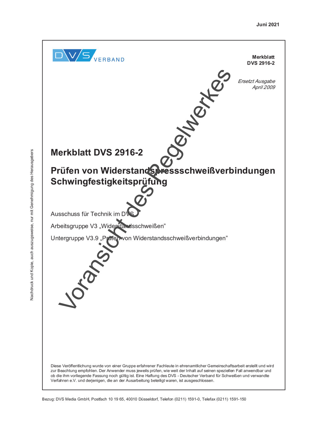 Das vorliegende Merkblatt DVS 2916 Teil 2 beschreibt die Durchführung von Schwingversuchen an widerstandsgeschweißten Dünnblechproben bis zu 3 mm Einzelblechdicke bei Raumtemperatur an Luft. Zweck der Schwingversuche ist die Ermittlung des Ermüdungsverhaltens von widerstandsgeschweißten Verbindungen bei verschiedenartiger schwingender Beanspruchung. Das Merkblatt gilt in erster Linie für Proben aus metallischen Werkstoffen im Dickenbereich von 0,5 bis 3,0 mm bei Raumtemperatur (RT). Bei entsprechenden Modifikationen der Proben und evtl. der Prüfvorrichtungen können Prüfungen auch bei größeren Dicken und bei höherer Temperatur sowie unter Medienbelastung durchgeführt werden. Eingesetzt wird die Schwingfestigkeitsprüfung vielfach in der Qualitätssicherung sowie in der Forschung und Entwicklung.