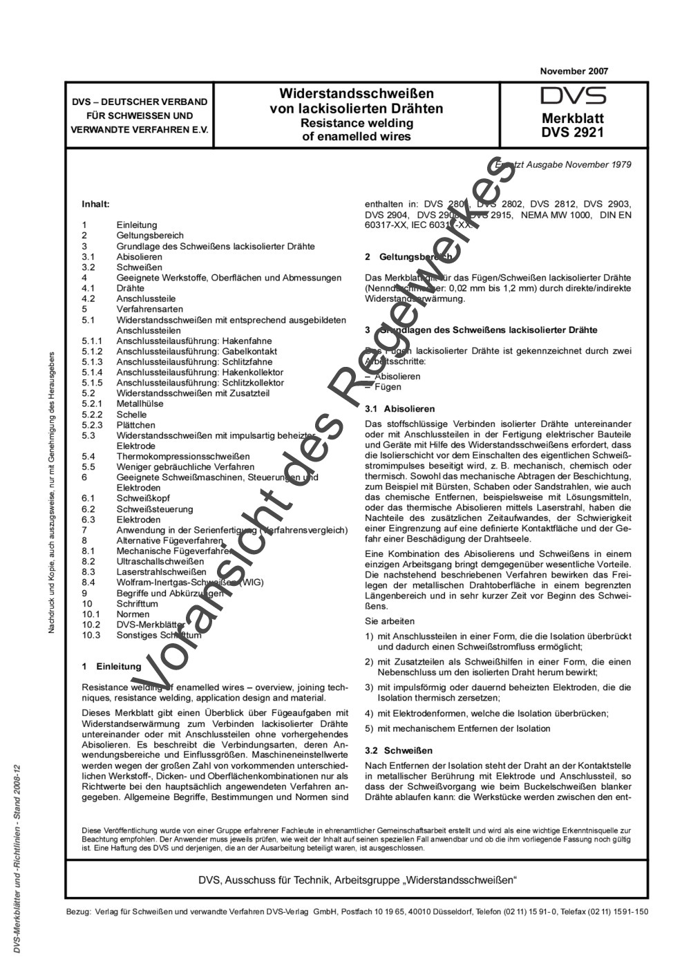 Resistance welding of enamelled wires – overview, joining techniques, resistance welding, application design and material. Dieses Merkblatt gibt einen Überblick über Fügeaufgaben mit Widerstandserwärmung zum Verbinden lackisolierter Drähte untereinander oder mit Anschlussteilen ohne vorhergehendes Abisolieren. Es beschreibt die Verbindungsarten, deren Anwendungsbereiche und Einflussgrößen. Maschineneinstellwerte werden wegen der großen Zahl von vorkommenden unterschiedlichen Werkstoff-, Dicken- und Oberflächenkombinationen nur als Richtwerte bei den hauptsächlich angewendeten Verfahren angegeben. Allgemeine Begriffe, Bestimmungen und Normen sind enthalten in: DVS 2801, DVS 2802, DVS 2812, DVS 2903, DVS 2904, DVS 2908, DVS 2915, NEMA MW 1000, DIN EN 60317-XX, IEC 60317-XX.