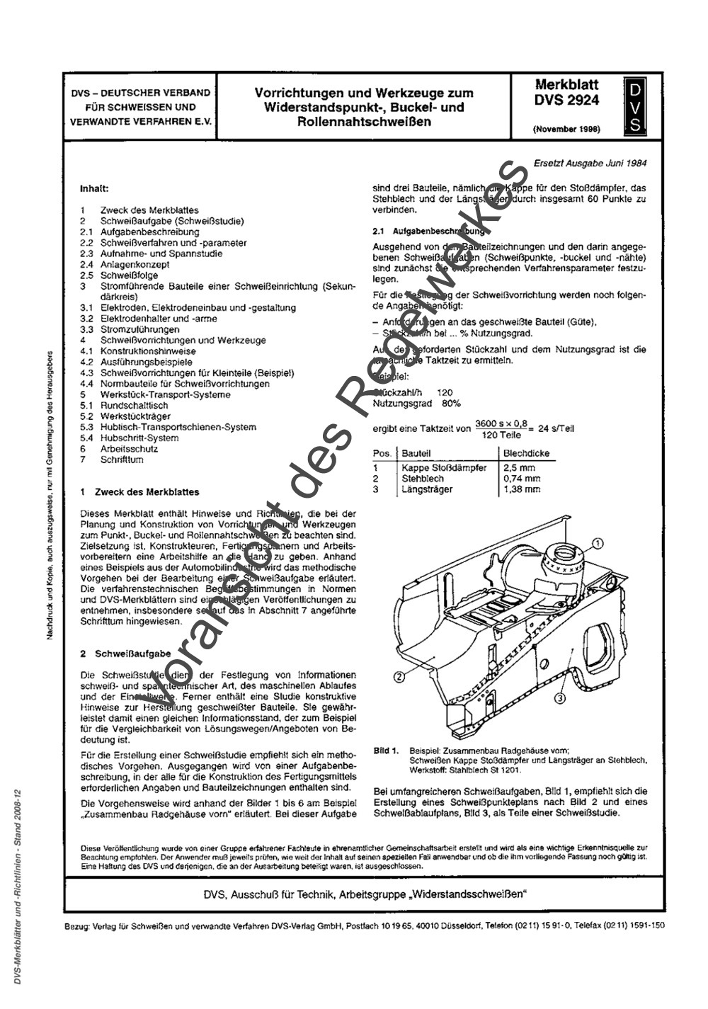 Diese Merkblatt enthält Hinweise und Richtlinien, die bei der Planung und Konstruktion von Vorrichtungen und Werkzeugen zum Punkt-, Buckel- und Rollennahtschweißen zu beachten sind. Zielsetzung ist, Konstrukteuren, Fertigungsplanern und Arbeitsvorbereitern eine Arbeitshilfe an die Hand zu geben. Anhand eines Beispiels aus der Automobilindustrie wird das methodische Vorgehen bei der Bearbeitung einer Schweißaufgabe erläutert. Die verfahrenstechnischen Begriffsbestimmungen in Normen und DVS-Merkblättern sind einschlägigen Veröffentlichungen zu entnehmen, insbesondere sei auf das in Abschnitt 7 angeführte Schrifttum hingewiesen.