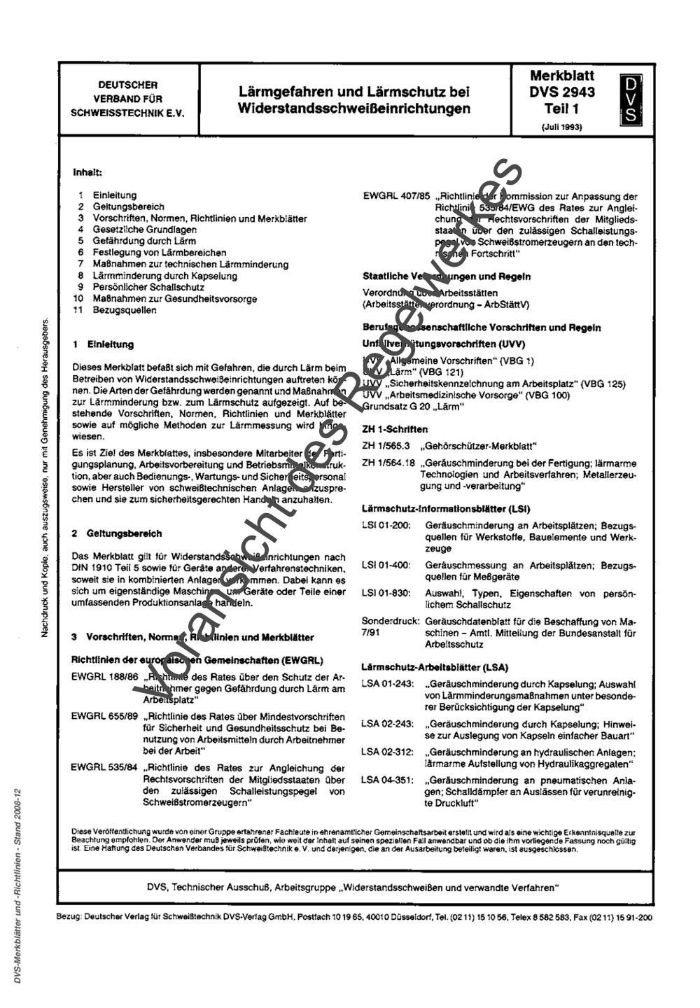 Diese Merkblatt befasst sich mit Gefahren, die durch Lärm beim Betreiben von Widerstandsschweißeinrichtungen auftreten können. Die Arten der Gefährdung werden genannt und Maßnahmen zur Lärmminderung bzw. zum Lärmschutz aufgezeigt. Auf bestehende Vorschriften, Normen, Richtlinien und Merkblätter sowie auf mögliche Methoden zur Lärmmessung wird hingewiesen. Es ist Ziel des Merkblatts, insbesondere Mitarbeiter der Fertigungsplanung, Arbeitsvorbereitung und Betriebsmittelkonstruktion, aber auch Bedienungs-, Wartungs- und Sicherheitspersonal sowie Hersteller von schweißtechnischen Anlagen anzusprechen und sie zum sicherheitsgerechten Handeln anzuhalten.