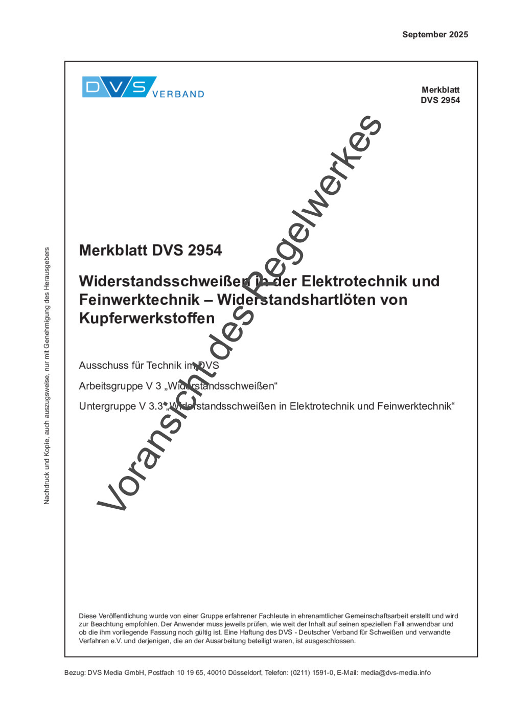 Das Merkblatt DVS 2954 gibt einen Überblick über das Hartlöten mittels konduktiver Widerstandserwärmung. Das Merkblatt beschäftigt sich dabei mit dem grundlegenden Verfahren (Grundlagen und Vorteile), der Anlagentechnik (mechanischer und elektrischer Teil, Elektroden sowie Lotzuführung) und der allgemeinen Ausführung. Die behandelten Werkstoffe sind Kupfer und Kupferlegierungen mit selbstfließenden Kupferloten. Das Merkblatt richtet sich an Anwender.