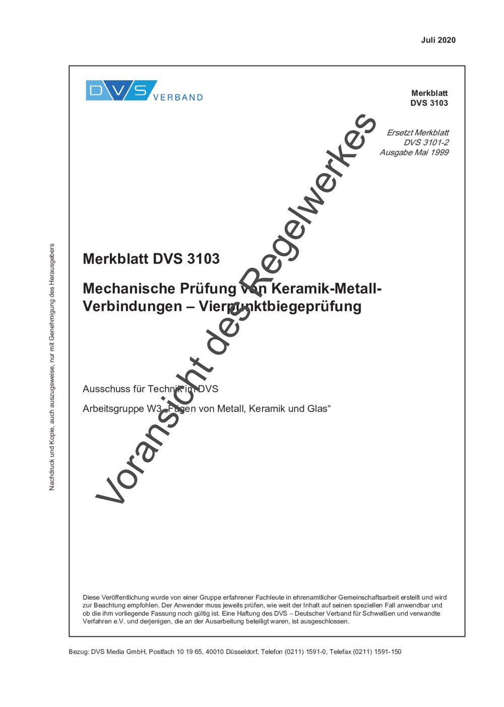 In diesem Merkblatt werden sowohl dem Hersteller als auch dem Anwender von stoffschlüssigen Keramik-Metall-Verbindungen Hinweise auf die technisch eingesetzten und erprobten Prüfmöglichkeiten zur Bestimmung der Festigkeit der Werkstoff-Verbunde gegeben. Es ist eine einheitliche Durchführung der Versuche anzustreben, so dass die ermittelten Festigkeitswerte vergleichbar werden. Entsprechend wird gezeigt wie die Proben herzustellen, die Versuchsergebnisse auszuwerten und zusammenzustellen sind. Die Anwendung der vorgestellten Prüfmöglichkeiten erstreckt sich auf Materialpaarungen, die zum einen die technischen Ingenieurkeramiken wie AI2O3, SiC, Si3N4 ZrO2 oder AIN betreffen und die zum anderen technisch häufig eingesetzte Metalllegierungen auf der Basis von Eisen, Nickel, Kupfer oder Aluminium beinhalten. Dieses Merkblatt ersetzt das bisher gültige Merkblatt DVS 3101-2.