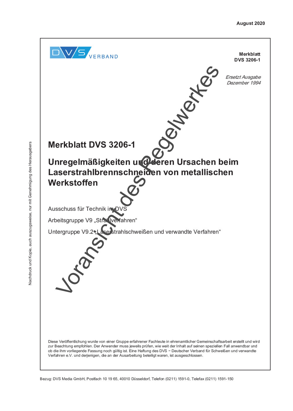 Das Laserstrahlbrennschneiden ist ein Standardverfahren mit welchem überwiegend Baustahl geschnitten wird. Die in diesem Merkblatt vorgenommene Erläuterung von Unregelmäßigkeiten soll dabei helfen, die Ursachen der beim Laserstrahlbrennschneiden möglichen Unregelmäßigkeiten zu erkennen und zu vermeiden, um dadurch die Schnittqualität zu erhöhen sowie die Wirtschaftlichkeit des Schneidverfahrens zu verbessern. Unter Unregelmäßigkeiten werden Abweichungen von der vorgesehenen Form und Lage des Schnittes verstanden. Das Merkblatt gibt nicht an, wie diese im Einzelfall zu beurteilen sind, weil dies von den jeweiligen Anforderungen an den Schnitt abhängt.