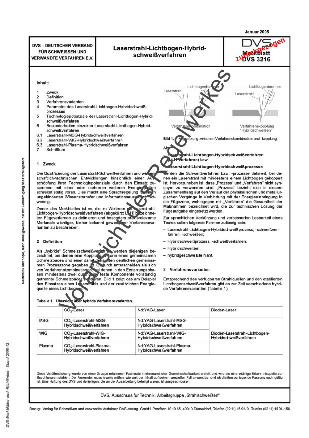 Die Qualifizierung der Laserstrahl-Schweißverfahren und wissenschaftlich-technischen Entwicklungen hinsichtlich einer Ausschöpfung ihrer Technologiepotenziale durch den Einsatz zusammen mit einer oder mehreren weiteren Energiequellen schreitet stetig voran. Dies macht eine Sprachreglung für einen ungehinderten Wissenstransfer und Informationsaustausch notwendig. Zweck dieses Merkblattes ist es, die im Weiteren als Laserstrahl-Lichtbogen-Hybridschweißverfahren (abgekürzt LLH) bezeichneten Fügeverfahren zu definieren und besonders praxisrelevante Merkmale wichtiger, bisher bekannt gewordener Verfahrensvarianten zu beschreiben.