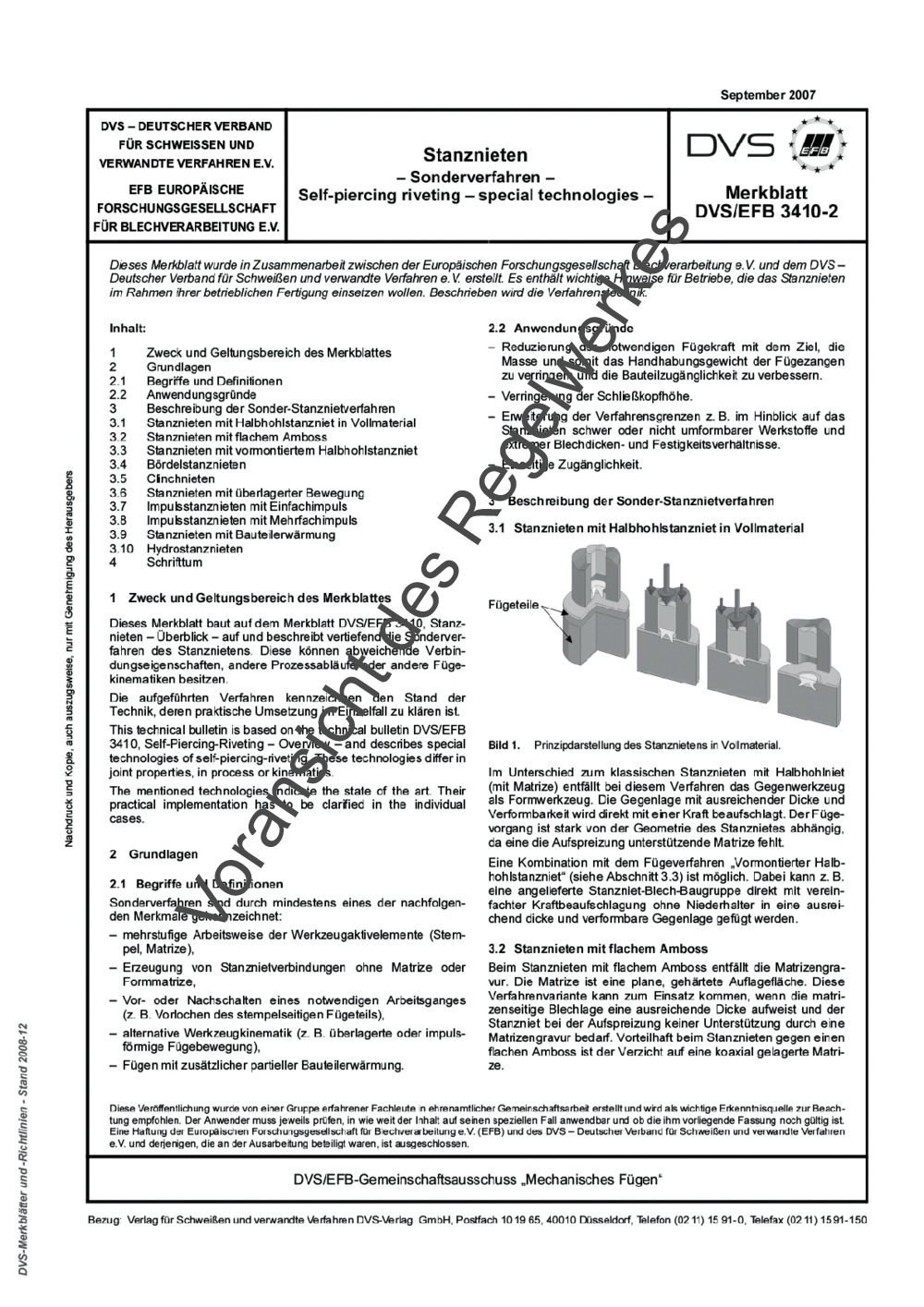 Dieses Merkblatt baut auf dem Merkblatt DVS/EFB 3410, Stanznieten - Überblick - auf und beschreibt vertiefend die Sonderverfahren des Stanznietens. Diese könne abweichende Verbindungseigenschaften, andere Prozessabläufe oder andere Fügekinematiken besitzen. Die aufgeführten Verfahren kennzeichnen den Stand der Technik, deren praktische Umsetzung im Einzelfall zu klären ist. ...