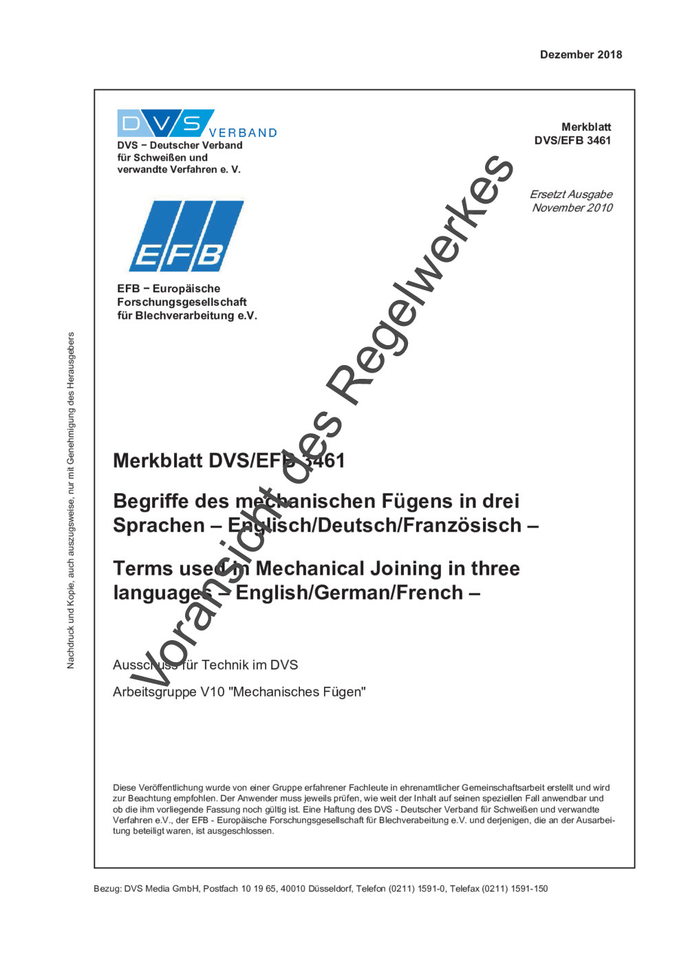 Diese Begriffssammlung des mechanischen Fügens wurde in Zusammenarbeit zwischen der Europäischen Forschungsgesellschaft für Blechverarbeitung e. V. (EFB), Hannover, und dem DVS – Deutscher Verband für Schweißen und verwandte Verfahren e. V., Düsseldorf, zusammengestellt. Sie enthält Begriffe, die in Zusammenhang mit den Verfahren des mechanischen Fügens wie dem Blindnieten, Bolzensetzen, Clinchen, Fließlochformendem Schrauben, Funktionselemente, Stanznieten und Schließringbolzen-Systemen Anwendung finden.