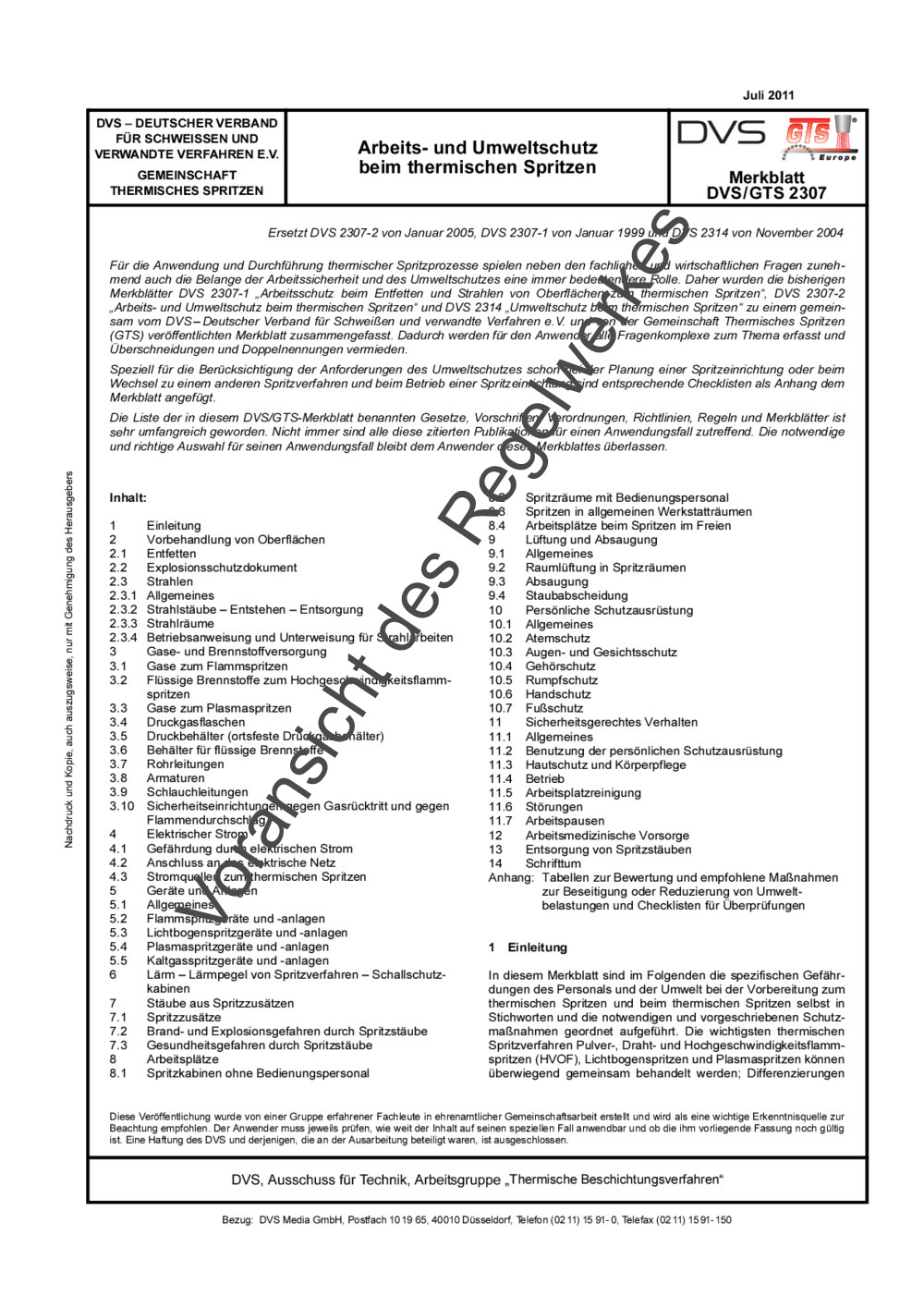 Für die Anwendung und Durchführung thermischer Spritzprozesse spielen neben den fachlichen und wirtschaftlichen Fragen zunehmend auch die Belange der Arbeitssicherheit und des Umweltschutzes eine immer bedeutendere Rolle. Daher wurden die bisherigen Merkblätter DVS 2307-1 „Arbeitsschutz beim Entfetten und Strahlen von Oberflächen zum thermischen Spritzen“, DVS 2307-2 „Arbeits- und Umweltschutz beim thermischen Spritzen“ und DVS 2314 „Umweltschutz beim thermischen Spritzen“ zu einem gemeinsam vom DVS – Deutscher Verband für Schweißen und verwandte Verfahren e.V. und von der Gemeinschaft Thermisches Spritzen (GTS) veröffentlichten Merkblatt zusammengefasst. Dadurch werden für den Anwender alle Fragenkomplexe zum Thema erfasst und Überschneidungen und Doppelnennungen vermieden. Speziell für die Berücksichtigung der Anforderungen des Umweltschutzes schon bei der Planung einer Spritzeinrichtung oder beim Wechsel zu einem anderen Spritzverfahren und beim Betrieb einer Spritzeinrichtung sind entsprechende Checklisten als Anhang dem Merkblatt angefügt. Die Liste der in diesem DVS/GTS-Merkblatt benannten Gesetze, Vorschriften, Verordnungen, Richtlinien, Regeln und Merkblätter ist sehr umfangreich geworden. Nicht immer sind alle diese zitierten Publikationen für einen Anwendungsfall zutreffend. Die notwendige und richtige Auswahl für seinen Anwendungsfall bleibt dem Anwender dieses Merkblattes überlassen.