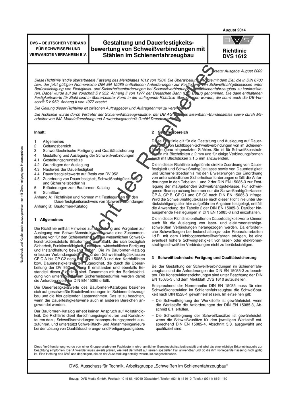 Diese Richtlinie gilt für die Gestaltung und Auslegung auf Dauerfestigkeit von Lichtbogen-Schweißverbindungen von im Schienenfahrzeugbau eingesetzten Stählen. Sie ist für Schweißkonstruktionen mit Blechdicken >= 2 mm und für einige Verbindungsformen auch mit Blechdicken >= 1,5 mm anzuwenden. Die in dieser Richtlinie aufgeführte direkte Zuordnung von Dauerfestigkeit und Schweißnahtgüteklasse sowie von Dauerfestigkeit und Sicherheitsbedürfnis mit den Erweiterungen zur Einordnung von unterschiedlichen Sicherheitsanforderungen erfüllt die Anforderungen in den Tabellen 1 und 2 der DIN EN 15085-3 zur Festlegung der maßgebenden Schweißnahtgüteklasse. Für schwingende Beanspruchung kommen nur die Schweißnahtgüteklassen CP A, CP B, CP C1 und CP C2 nach DIN EN 15085-3 infrage. Wird die Schweißnahtgüteklasse nach dieser Richtlinie unter Berücksichtigung aller hier aufgeführten Angaben festgelegt, entfällt die Anwendung der Tabelle 2 der DIN EN 15085-3. Darüber hinausgehende Festlegungen in DIN EN 15085-3 sind einzuhalten. Die in dieser Richtlinie enthaltenen Dauerfestigkeitswerte können auch für die Auslegung von laser- und elektronenstrahlgeschweißten Verbindungen herangezogen werden. Da erforderliche Schweißungen bei Instandhaltungs- oder Reparaturarbeiten i.d.R. mit dem Lichtbogenschweißverfahren erfolgen, ist eine eventuell höhere Schwingfestigkeit von laser- oder elektronenstrahlgeschweißten Verbindungen nicht zu berücksichtigen.