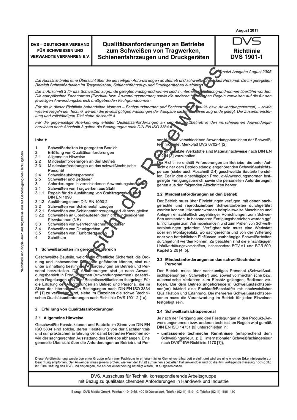 Die Richtlinie bietet eine Übersicht über die derzeitigen Anforderungen an Betrieb und schweißtechnisches Personal, die im geregelten Bereich Schweißarbeiten im Tragwerksbau, Schienenfahrzeug und Druckgerätebau ausführen. Die in Abschnitt 3 für das Schweißen zugrunde gelegten Fachgrundnormen sind in internationale Fachgrundnormen überführt worden. Die europäischen Fachnormen (Produkt- bzw. Anwendungsnormen) sowie die anderen technischen Regeln verweisen auf die für den jeweiligen Anwendungsbereich maßgebenden Fachgrundnormen. Für die in dieser Richtlinie behandelten Normen – Fachgrundnormen und Fachnormen (Produkt- bzw. Anwendungsnormen) – sowie weitere Regeln der Technik werden die jeweils gütigen Fassungen der Ausgabe dieser Richtlinie zugrunde gelegt. Die Zusammenstellung und vollständigen Titel siehe Abschnitt 4. Für die gegenseitige Anerkennung erfüllter Qualitätsanforderungen an den Schweißbetrieb in den verschiedenen Anwendungsbereichen nach Abschnitt 3 gelten die Bedingungen nach DIN EN ISO 3834 ff.