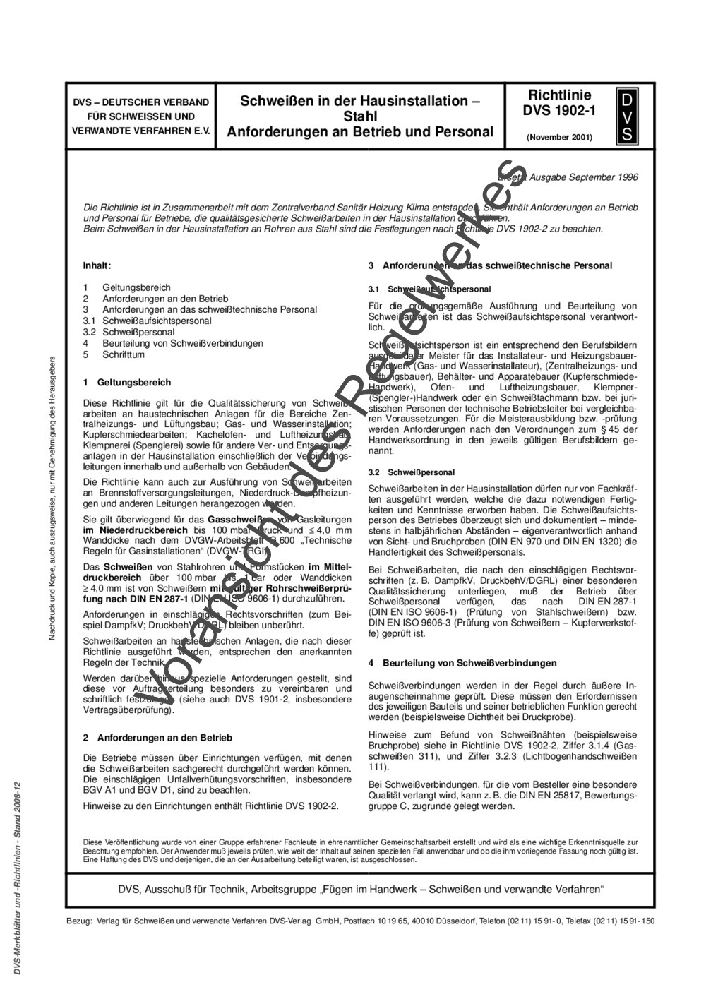Hinweis: Auf Beschluss der AG Q2. wurde im Dezember 2024 entschieden, dass die Richtlinie DVS 1902-12 „Schweißen in der Hausinstallation − Stahl − Anforderungen an Betrieb und Personal“ ersatzlos zurückgezogen wird.